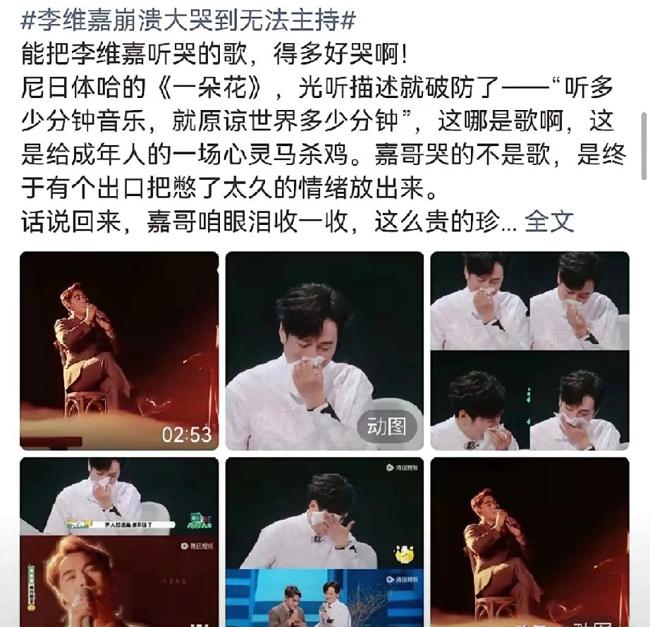 李维嘉录节目崩溃大哭!哽咽到无法主持,录制被迫中断 3月20日,李维嘉在《魔力歌先生》现场突然情绪失控,冲上热搜。彝族歌手尼日体哈穿80元二手西装演唱《一朵花》,歌词里“听多少分钟音乐,就原谅世界多少分钟”直击人心。 一向沉稳的李维嘉瞬间破防,当场崩溃痛哭,连主持词都念不下去,节目被迫暂停。他卸下所有伪装,将积压的压力与委屈尽数释放。 网友纷纷心疼:成年人的崩溃只在一瞬间,这是最真实的情绪宣泄。 李维嘉综艺感 李维嘉出场费