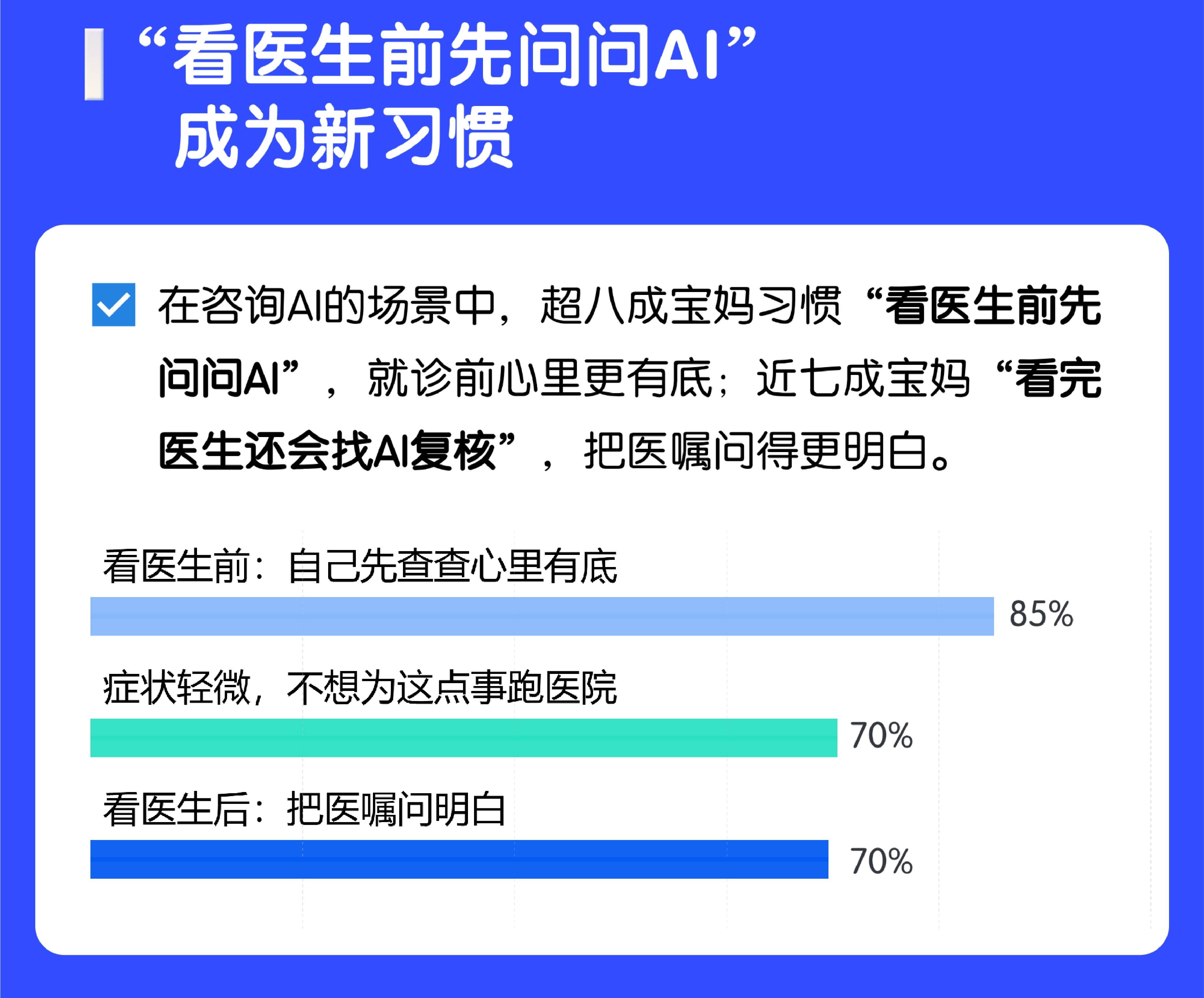 超8成宝妈习惯看医生前先问AI娃一不舒服,当妈的就慌,现在超8成宝妈都跟我一样,先掏出手机问AI!有个靠谱的‘帮手’先给点建议,心里瞬间不抓瞎了,这感觉特踏实。当然不是不信医生,是AI能帮咱提前学习、捋清思路,去医院沟通更高效,这科技红利咱得接住
