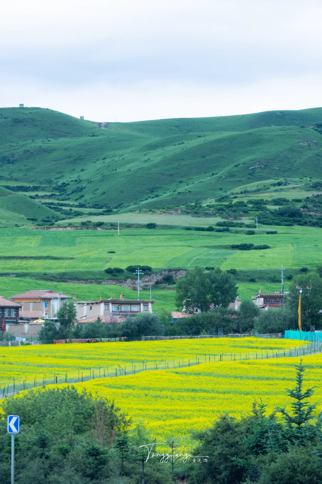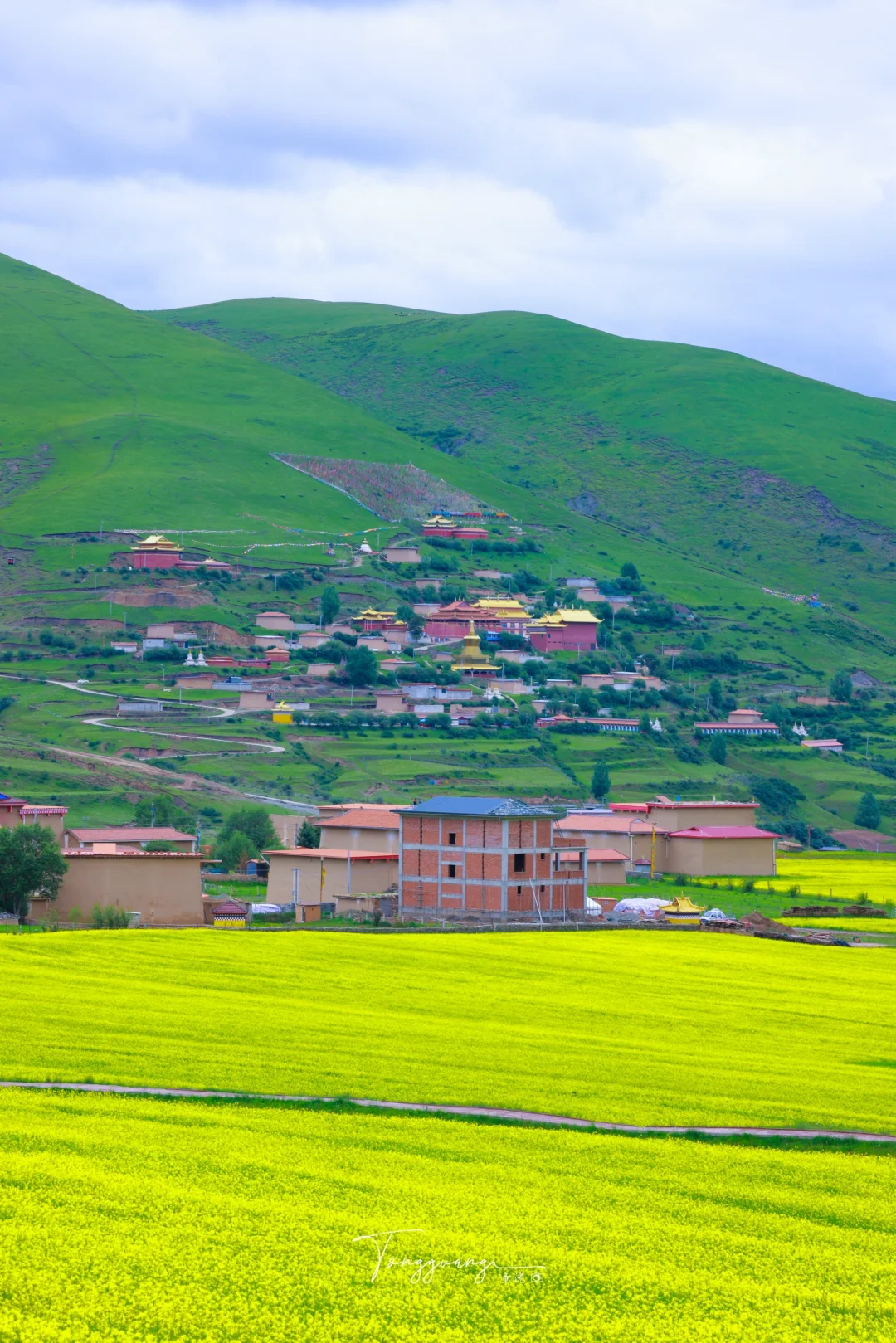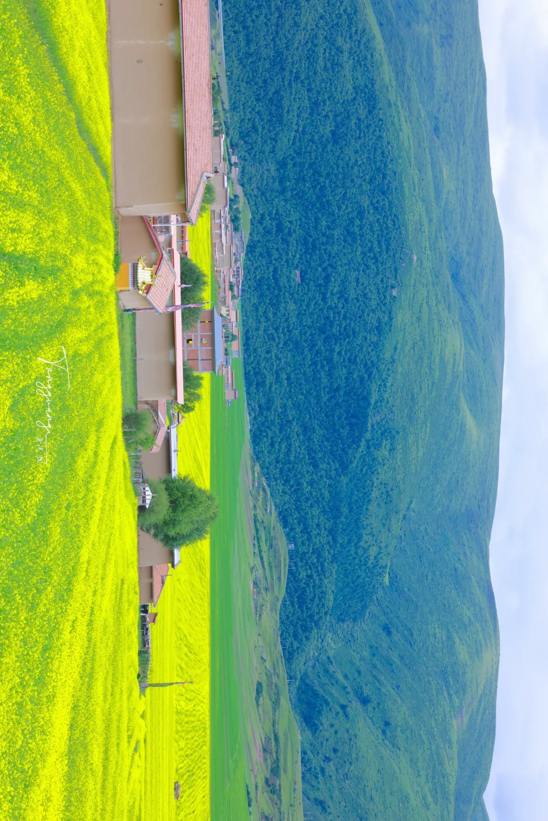 在去阿坝县的路上 看到一大片油菜花海 能在夏天的七月看到油菜花 也是让人挺意外的 蓝天白云与金色花海相映 随手停车即入画 人也不多,可以尽情的在花海里游玩 拍照:无人机视角必试,俯拍花海文字主题 💡小贴士: 防晒霜+墨镜必备,高原紫外线超强 爱护花田勿踩踏,找自然空隙位拍照 🚗附近游玩: 莲宝叶则,各莫寺,格尔登寺等等 人文,寺庙,看神山与花海同框的奇景 一同欣赏 📍导航:阿坝县麦昆乡蚕木扎村 🎫门票:免费