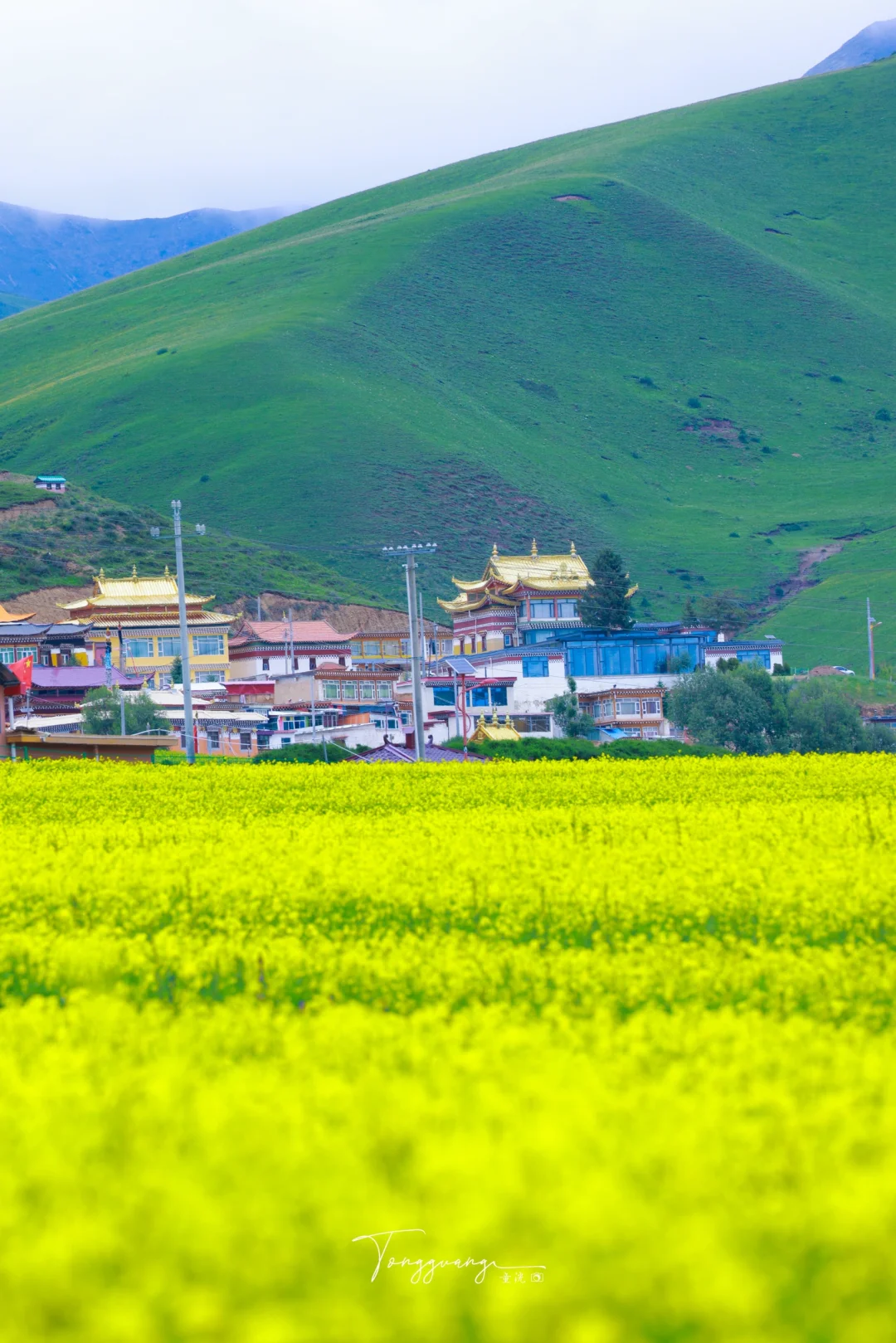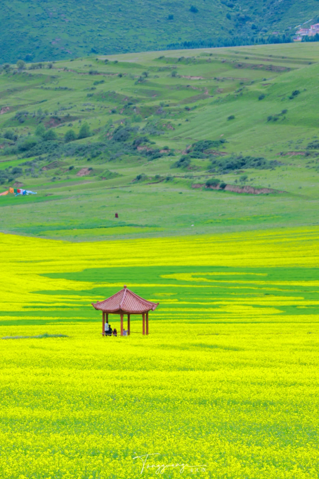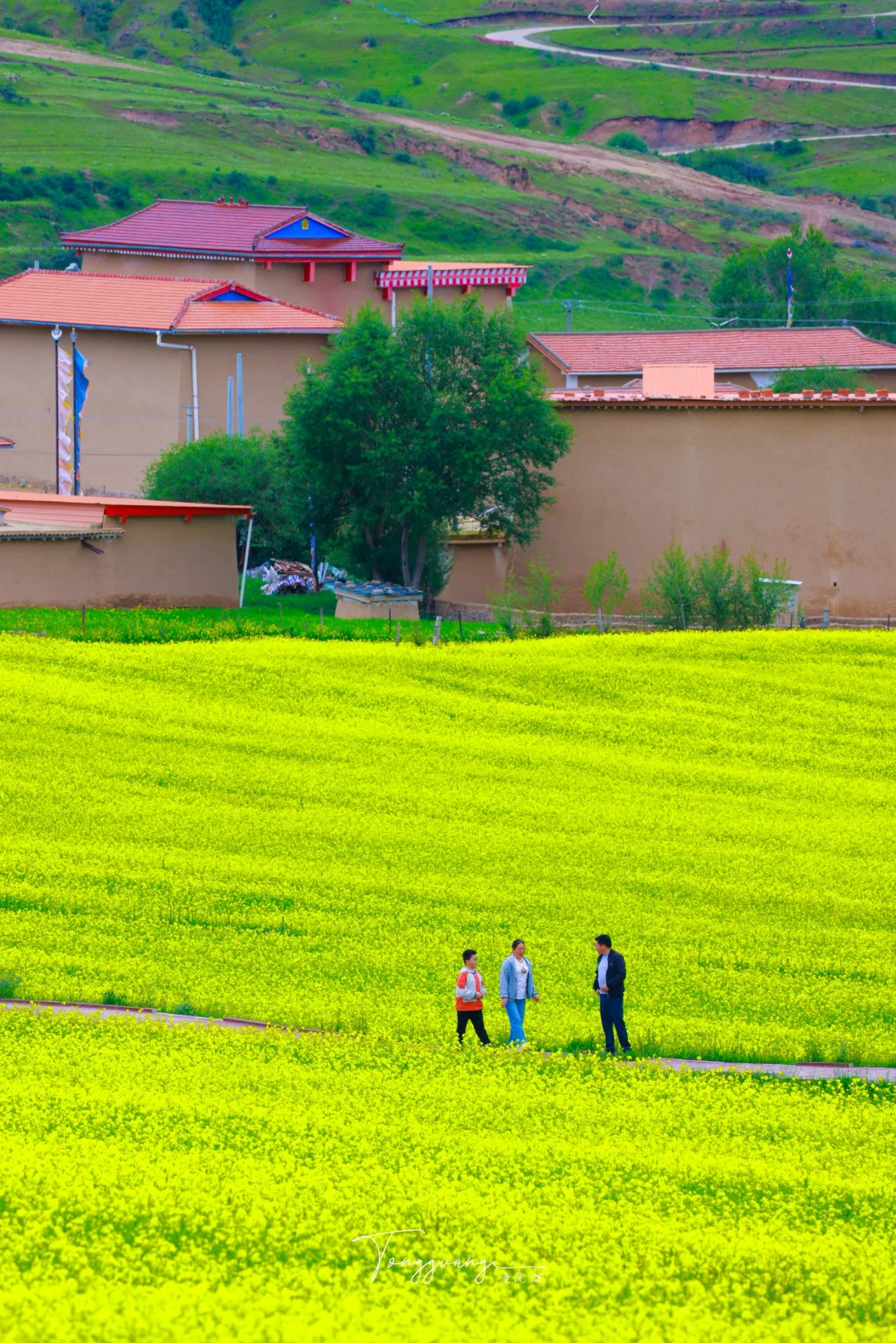 在去阿坝县的路上 看到一大片油菜花海 能在夏天的七月看到油菜花 也是让人挺意外的 蓝天白云与金色花海相映 随手停车即入画 人也不多,可以尽情的在花海里游玩 拍照:无人机视角必试,俯拍花海文字主题 💡小贴士: 防晒霜+墨镜必备,高原紫外线超强 爱护花田勿踩踏,找自然空隙位拍照 🚗附近游玩: 莲宝叶则,各莫寺,格尔登寺等等 人文,寺庙,看神山与花海同框的奇景 一同欣赏 📍导航:阿坝县麦昆乡蚕木扎村 🎫门票:免费
