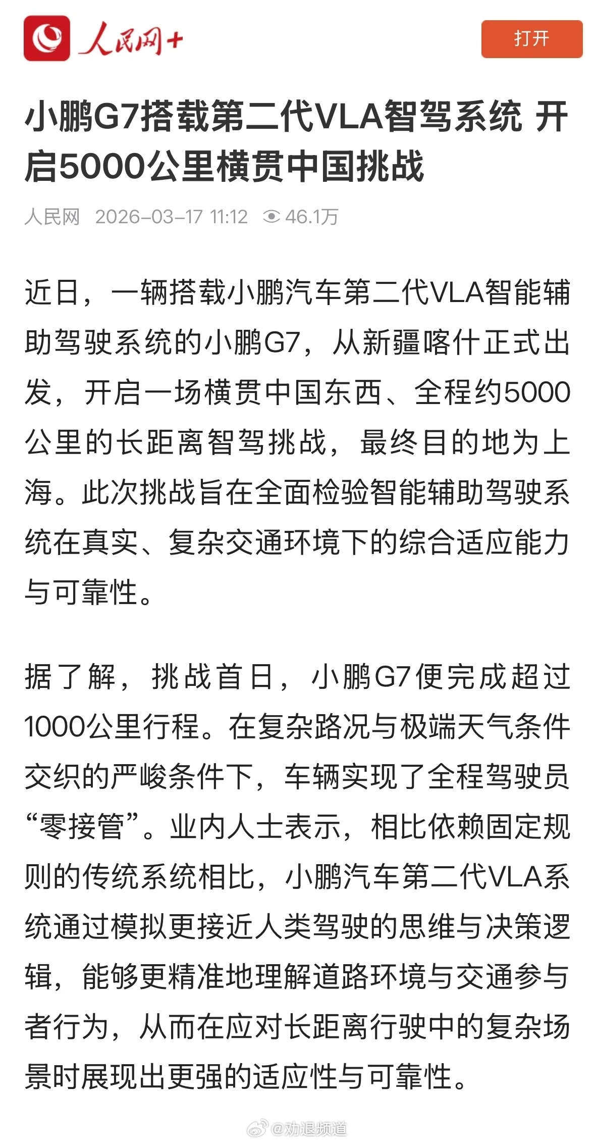 第二代VLA已经开始推送了,当智驾安心到让爸妈都敢用、爱用,开车去远方真的就可以享受旅程本身。 小鹏G7第二代VLA智驾5000公里横穿中国,这下辅助驾驶真的能堪大任了。