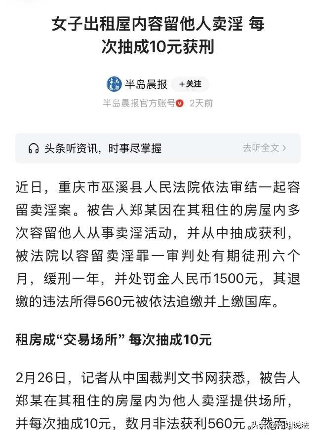 重庆,一女子自己租了一套房屋,跟另外几个女子商议,可以将房屋提供给她们,用来做违法的事情。商定之后,另外几个女子真的就带着男客人进来了,完事之后,租房的女子还参与了分成,每一单拿10块钱,前后一共赚取了560元。只不过,这钱可不是这么好赚的,事件被告发之后,这个女租客就悲剧了。 半岛晨报3月18日报道了这则新闻。 重庆市巫溪县的一名女子郑某,来到这个城市打工,就租住了一套房屋。 打工期间,郑某总感觉钱难挣,她考虑要找个出路,多一个赚钱的门道。 再看看自己租住的这套房屋,挺大的,自己一个人也住不了这么多房间,她心里想着,是不是可以把空制的房屋再转租出去呢? 有一天,郑某在大街上遇到了一个女子吴某,这个吴某不是做正常工作的。 郑某看到吴某有的时候,也没有一个正规的去处,她就决心跟吴某谈一谈合作的事情。 所谓的合作,就是郑某提供自己的出租屋,作为吴某做生意的场所。 这么一聊,吴某感觉,这个可以节约她的成本,起码不需要自己到外面去租房子了啊。 吴某甚至还推荐了其他的好姐妹,邀请她们一起过来,跟郑某谈谈合作。 这件事就这样一拍即合,大家都赞成了,之后,“合作”也就正式开展了。 吴某、杨某等,自己吸纳客户之后,就会带回来,来到郑某的出租屋内,从事非法的事情。每次完事之后,两位女子都会跟郑某去抽成,一单会给到她10块钱。 郑某拿到钱之后,感觉,这份“收入”,也太轻松了,这不得比自己辛苦搬砖来的容易? 于是,郑某越来越疯狂,几个女子打配合,将工作推进的非常顺利。 就这样,几个月下来,郑某一共获取了560元的收入了。 然而,做违法的事情,怎么可能一帆风顺了,很快,周围就有人举报了,郑某她们所做的事情,就这样被戳破了。 当时,吴某正在出租屋内做不法之事,突然,相关部门的工作人员得到举报,直接破门而入,将吴某当场给抓获。 吴某被抓之后,供出了杨某,还把出租房屋的郑某也给供了出来,之后郑某也被抓捕归案。 被抓之后,郑某如实供述了自己的全部犯罪事实,并且积极认罪认罚。案发之后,郑某560元的非法收入也被退缴。 像郑某这种,并没有直接从事非法的行为,她也要被判刑吗? 答案是肯定的,郑某的行为构成容留罪。 所谓容留罪,指的就是提供房屋场所,容留他人去做违法的事情,如果还从中抽取利润以此获利,那么罪行就更大。 郑某因为涉嫌容留罪,被判处有期徒刑6个月,缓刑1年,退缴全部违法所得,另外罚款1500元。 宣判之后,郑某当场服从判决,不上诉。 在法律规定中,容留他人犯罪,属于不小的罪行。 根据《刑法》规定,容留他人从事非法的男女之间的罪行,会被处以5年以下有期徒刑、拘役或者管制,并且处以罚金。 获利金额,对于量刑也存在影响。如果获利金额不足1000元,一般按照基本情节处理,如果行为人认罪认罚、积极退赃,则可以适用于缓刑。 从郑某的行为来看,她把自己租下来的房子,提供给其他人去做违法的事情,并且还从中获利,已经构成了典型的容留罪。 根据获利金额,郑某非法获得560元,金额低于1000元,且被抓之后积极认罪、主动退赃,考虑到可以给与从宽处理。 也有人会问,那么房东是否也需要担责呢? 根据《刑法》规定,“罪责自负”,租客自己实施了容留犯罪,由本人承担法律责任,房东作为房屋所有权人,完全不知情,则不需要承担连带的责任。 因此,房东是否要承担责任,关键就在于他是否知情。如果不知道租客利用他的房屋去从事违法的事情,则不需要担责,按共犯论处,刑责更重。 但是如果知情、默认,或者放任不管,甚至也不履行法定的监管义务,可能构成共同犯罪,届时则需要承担一定的法律责任。 法律的核心,未参与、未知情、未获利、未纵容,那就不构成犯罪。 大家在看完这则案例之后,是否可以从中学到一定的“法”的定性呢? 欢迎大家评论区留言讨论。