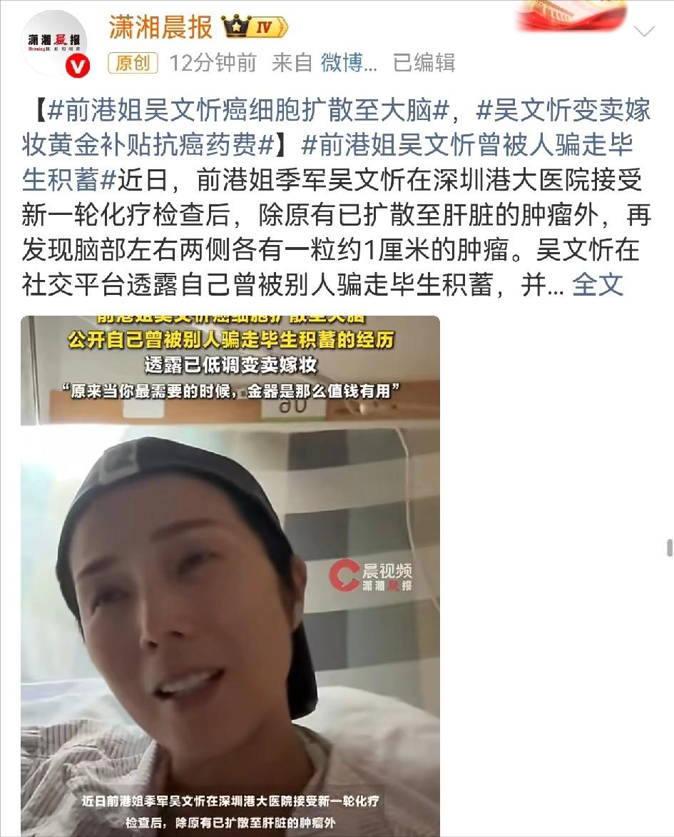 3月19日,娱乐圈里静悄悄,没想到中午时分,突然传来一个让人十分糟心的消息,前港姐季军吴文忻突然冲上热搜,她悲惨的经历,让许多网友心生同情。 2026年3月19日中午,娱乐圈的午后被一则消息彻底撕碎。 前港姐季军吴文忻的名字突然冲上热搜,评论区涌入的不是往日的风光,而是一串令人窒息的医学数据:肝脏扩散,脑部新增两个1厘米大小的阴影。 五年了。这条抗癌路走到今天,终于迎来了最凶险的拐点。 但凡事皆有代价。五年前那个悄悄躺在手术台上的女人,大概想不到命运会跟她开这么大的玩笑。 2022年刚确诊乳腺癌时,她选择独自扛。手术是偷偷做的,家人瞒着,公众更是一无所知。港姐的光环还在,镜头前的笑容还在,谁也不知道那个光鲜亮丽的女人已经开始和死神讨价还价。 转机出现在1998年。她拿下港姐季军,签约TVB,《功夫足球》《街市的童话》一部接一部。那时候的吴文忻,是多少人心中的港风女神。 可惜光环从来不是护身符。 2024年,癌症复发,扩散到淋巴。2025年,更糟糕的消息传来,癌细胞攻占了尾龙骨,疼得整夜睡不着,心肺开始积水。她胸口的患处出现溃烂,散发出的气味十分刺鼻,就连她自己闻到都觉得难以忍受,身心都承受着巨大的煎熬。 癌细胞像一支训练有素的军队,从乳腺到淋巴,从骨骼到内脏,最后连大脑这片最后的净土都没放过。 就在这时候,积蓄被骗了个精光。 这笔钱对她而言至关重要,是支撑她继续接受治疗、对抗病痛的重要依靠,也是她坚持下去的唯一希望。一夜之间,全部归零。 没有流泪,也没有失态吵闹,更没有像部分公众人物那样,通过公开募捐的方式博取大众同情,始终保持着低调克制的态度,默默承受着一切。 她找出了当年结婚时陪嫁的金饰,还有那块玫瑰金腕表与几件钻饰,一件件整齐地摆放在柜台之上。 “中国人买金子保值真的太聪明了!”她在采访中感叹。字里行间没有抱怨,只有一个被逼到绝路的女人对命运最后的调侃。 金器换来的钱,一分一分都换成了抗癌药。 卖掉的不仅是首饰,更是一个女人最后的体面和退路。 今年3月初,导演彭秀慧邀请一众好友相聚,在酒店内为自己举办了一场特别的“生前告别式”,以一种独特的方式提前与亲友分享心声,这场特殊的聚会也引发了不少关注与讨论。没有悲伤的挽联,没有肃穆的黑白照片,到场的人举着香槟,笑着回忆她的过往。 吴文忻现场情绪激动,忍不住红了眼眶。活动结束后,她特意发文向所有到场支持的人致谢,言语真挚动人:“由衷感谢每一位前来的朋友,是大家的陪伴与心意,给了我坚持下去的勇气和力量。”” 那大概是她这五年来为数不多的慰藉。 但温暖归温暖,治疗方案还得她自己拿。 医生建议全脑放疗,效果最直接。可她拒绝了。 理由很简单:放疗可能让她失去清醒,而她想保留每一分神志,好好陪陪两个年幼的女儿。 一个被癌细胞步步紧逼的女人,在生死关头选择的不是最优解,而是“最清醒”的解。 母爱这种东西,有时候比癌细胞还要顽固。 消息曝光后,评论区炸了。有人心疼,有人骂那个骗走她积蓄的混蛋,有人默默点了根蜡烛。 “关关难过关关过”,这是她给自己打气的话。 娱乐圈的残酷在于,它从来不缺风光无限的顶流,却很少有人记得那些被流量抛弃的面孔。吴文忻不是个例,而是这个圈子最隐秘角落的缩影。 在同一个行业领域里,人与人之间的境遇天差地别。有的人事业顺遂、收入丰厚,生活过得安稳富足;也有的人被健康问题困扰,加上经济拮据,只能在艰难中苦苦支撑,让人不禁感叹命运的悬殊。 她现在还在深圳港大医院坚持化疗,没有放弃。 2个1厘米的脑瘤还在,肝脏的阴影还在,胸口的溃烂还在,可那个1998年的港姐季军还在。 卖掉的嫁妆碎金换来的药正在起作用,彭秀慧们的温暖还在她的手机里存着。 至于未来会怎样,没人知道。 但至少现在,她还清醒着,还在战斗着。 参考信息:澎湃新闻.(2026-03-19).TVB演员吴文忻自曝患癌时被骗光全部积蓄:婉拒募捐提议,卖掉出嫁金器、玫瑰金手表、钻石首饰。曾出演《功夫足球》