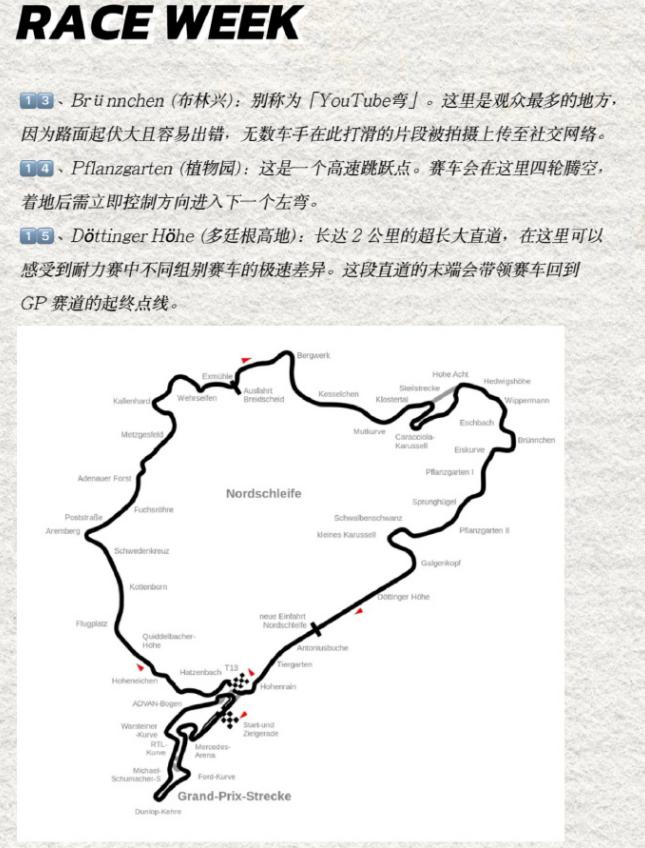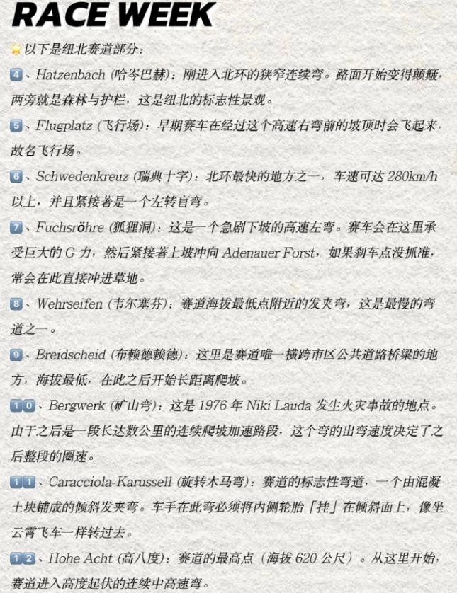 纽博格林赛道介绍(二) 四、F1 历史与安全争议 纽北曾是 F1 最古老赛道之一,1951-1954、1956-1958、1961-1969、1971-1976 年间承办 F1 大奖赛 1976 年后因安全性问题永久退出 F1 赛程:路面颠簸、海拔落差大、缓冲区不足、赛道狭窄(8-9 公尺)、超长距离导致救援车辆无法在黄金时间抵达事故现场 F1 正式大奖赛周末期间,约有 5 位车手在此丧生:Onofre Marimón(1954)、Peter Collins(1958)、Carel Godin de Beaufort(1964)、John Taylor(1966)、Gerhard Mitter(1969) 若包含所有赛事与测试,死亡名单估计超过70 至 200 人(早期纪录不全,数字有争议) 1976 年尼基・劳达在 Bergwerk 弯道前左转弯段发生事故,赛车撞击护栏后起火,被困高温座舱近 1 分钟,后被四位车手救出;赛前他曾发起投票抵制比赛,理由是赛道太长、救护设施不足 1984 年现代化 GP 赛道完工后 F1 重返纽博格林,2020 年艾费尔大奖赛中 Max Verstappen 获得排位赛第三、正赛第二及正赛最快单圈 五、赛道别称与经典弯角 别称:F1 三届世界冠军杰基・斯图尔特爵士在 1968 年德国大奖赛后,将纽北形容为「绿色地狱」,这成为其最著名别称 NLS2 赛事关键弯角: Yokohama-S(T1-T3):起跑后下坡右 - 左 - 右复合弯,耐力赛高发碰撞区 Mercedes-Arena(奔驰竞技场):2000 年代加入的现代弯道序列,增加超车机会但被老派车手认为破坏节奏 13 号出口(T13 Link):从 T13 大直道末端左转切入北环 北环经典弯角: 4. Hatzenbach(哈岑巴赫):进入北环的狭窄连续弯,路面颠簸,两旁是森林与护栏 5. Flugplatz(飞行场):高速右弯前坡顶,早期赛车会飞起 6. Schwedenkreuz(瑞典十字):北环最快路段之一,车速可达 280km/h 以上,后接左转盲弯 7. Fuchsröhre(狐狸洞):急剧下坡高速左弯,承受巨大 G 力,后接上坡,刹车点失误易冲进草地 8. Wehrseifen(韦尔塞芬):海拔最低点附近发夹弯,最慢弯道之一 9. Breidscheid(布赖德赖德):唯一横跨市区公共道路桥梁的地点,海拔最低,之后开始长距离爬坡 10. Bergwerk(矿山弯):1976 年尼基・劳达事故地点,出弯速度决定后续爬坡段圈速 11. Caracciola-Karussell(旋转木马弯):标志性倾斜发夹弯,车手需将内侧轮胎「挂」在倾斜面上通过 12. Hohe Acht(高八度):赛道最高点(海拔 620 公尺),之后进入高度起伏的连续中高速弯 13. Brünnchen(布林兴):别称「YouTube 弯」,观众最多,路面起伏大易出错,大量打滑片段被上传网络 14. Pflanzgarten(植物园):高速跳跃点,赛车四轮腾空,着地后需立即控制方向 15. Döttinger Höhe(多廷根高地):2 公里超长大直道,展现不同组别赛车极速差异,末端回到 GP 赛道起终点线 最终总结 纽博格林北环是世界上最具挑战性与危险性的赛道之一,它既是工程与自然地形的极致结合,也承载着沉重的安全代价与赛车历史记忆,「绿色地狱」的别称精准概括了它既迷人又残酷的本质。【来自懂车帝车友圈】