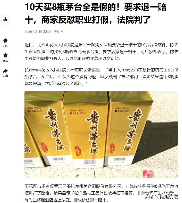 湖南长沙,陈先生,10天里在同一家烟酒店,先后买了8瓶飞天茅台。买完没开封,就发现酒的细节不对劲,立马送市监局鉴定,结果8瓶全是假的。陈先生找商家要退一赔十,商家却喊冤说自己不知情,还咬着陈先生买8瓶的数量不放,怀疑他是职业打假人讹钱,坚决不赔偿。双方谈不拢闹上法庭,最终法院认定陈先生合理消费需求就2瓶,这2瓶能按10倍赔偿,剩下6瓶只退购酒款。 8瓶飞天茅台,没一瓶是真的。 长沙的陈先生,对此深有体会。 他爱喝酒,更懂酒,家里常年备着各类白酒,飞天茅台也买过不少次。 10天时间,他在小区附近一家烟酒店,分3次买了8瓶飞天茅台。 第一次买2瓶,花了2800元,单价1400元,当时没细看,觉得熟人开店不会有问题。 3天后,他又去买了3瓶,还是同样单价,花了4200元。 再过4天,他第三次到店,买了最后3瓶,又花4200元。 8瓶酒,总共花了2800+4200+4200=11200元,他全部放在书房,没开封。 这天晚上,他准备拿1瓶招待朋友,刚拿起酒瓶,就觉出了不对劲。 瓶盖的齿轮,正品该是13个,这8瓶全是14个,齿槽形状也完全一样。 瓶身的飞天标,仙女飘带僵硬,交叉处有明显重叠,正品从不会这样。 更明显的是,背标17位有机码,数字边缘有毛刺,一看就是喷墨印刷,正品是激光刻印。 懂酒的陈先生心里一沉,没敢开封,第二天一早就抱着8瓶酒去了市监局。 市监局不敢怠慢,立刻委托贵州茅台酒股份有限公司进行鉴定。 3天后,鉴定结果出来了,8瓶全是假酒,无一瓶例外。 拿着鉴定报告,陈先生第一时间找到那家烟酒店。 退一赔十,他只提了这一个要求。 商家却一脸委屈,连连摆手,说自己也是受害者。 酒是上游供货商送的,他没能力鉴别真假,进货时也查了供货商的资质。 更让陈先生生气的是,商家话锋一转,开始怀疑他。 10天买8瓶,还不开封,哪有这样的正常消费者。 商家一口咬定,陈先生是职业打假人,就是想借着假酒讹钱。 赔偿没有,只能退还他11200元的购酒款,多一分都没有。 陈先生不干,自己花了钱,买的却是假酒,商家还倒打一耙。 协商无果,他直接整理好所有证据,把商家告上了法庭。 陈先生拿出鉴定报告、购酒小票、付款记录,铁证如山。 商家却始终咬住两个点不放,一是自己不知情,二是陈先生购买数量异常。 商家辩称,正常家庭消费,10天买8瓶飞天茅台,完全超出合理范围。 陈先生则反驳,自己偶尔会招待朋友,也会囤一些好酒,8瓶不算多。 法院审理后,综合了各方证据和实际情况,给出了以下判决: 8瓶酒经官方鉴定均为假酒,商家销售假酒属实,需全额退还购酒款11200元。 关于退一赔十,法院认定陈先生的合理生活消费需求为2瓶。 2瓶酒的单价1400元,十倍赔偿就是1400×2×10=28000元。 也就是说,商家最终要支付给陈先生的总金额,是11200+28000=39200元。 判决下来后,陈先生虽有不满,觉得8瓶都是假的,都该按十倍赔偿。 商家则表示,会履行判决,同时也会找上游供货商追责。 本案法律解析: 1,商家不知情,就不用承担赔偿责任吗? 根据《食品安全法》148条第2款规定,经营明知是不符合食品安全标准的食品,消费者可要求退一赔十。 这里的“明知”,不只是故意,还包括应当知道。 商家作为烟酒销售者,有义务对所售商品的真伪进行查验,不能以不知情为由推脱责任,其未履行查验义务,就应承担赔偿责任。 2,陈先生买8瓶茅台,为什么只支持2瓶十倍赔偿? 不是只要买了假酒,不管多少瓶,都能得到退一赔十。 最高法相关司法解释明确,惩罚性赔偿仅在合理生活消费需要内支持。 法院结合飞天茅台的高档属性、普通家庭消费习惯,认定2瓶为合理需求,超出部分不支持十倍赔偿,既保护了消费者权益,也避免了过度索赔。 即使陈先生有知假买假的嫌疑,只要商品确实是假的,且在合理消费范围内,其维权就受法律保护。 但如果是以牟利为目的,超出合理范围大量购买并恶意索赔,可能构成敲诈勒索,法院会驳回其诉求,甚至移送公安追责。 陈先生未超出合理范围,所以,也支持他2瓶的十倍赔偿。 买假酒维权,到底该买多少才不算过度?合理消费的边界,该由谁来界定呢? 为方便理解,做了具体酒款的标注,切勿过分解读。 信息来源于:光明网