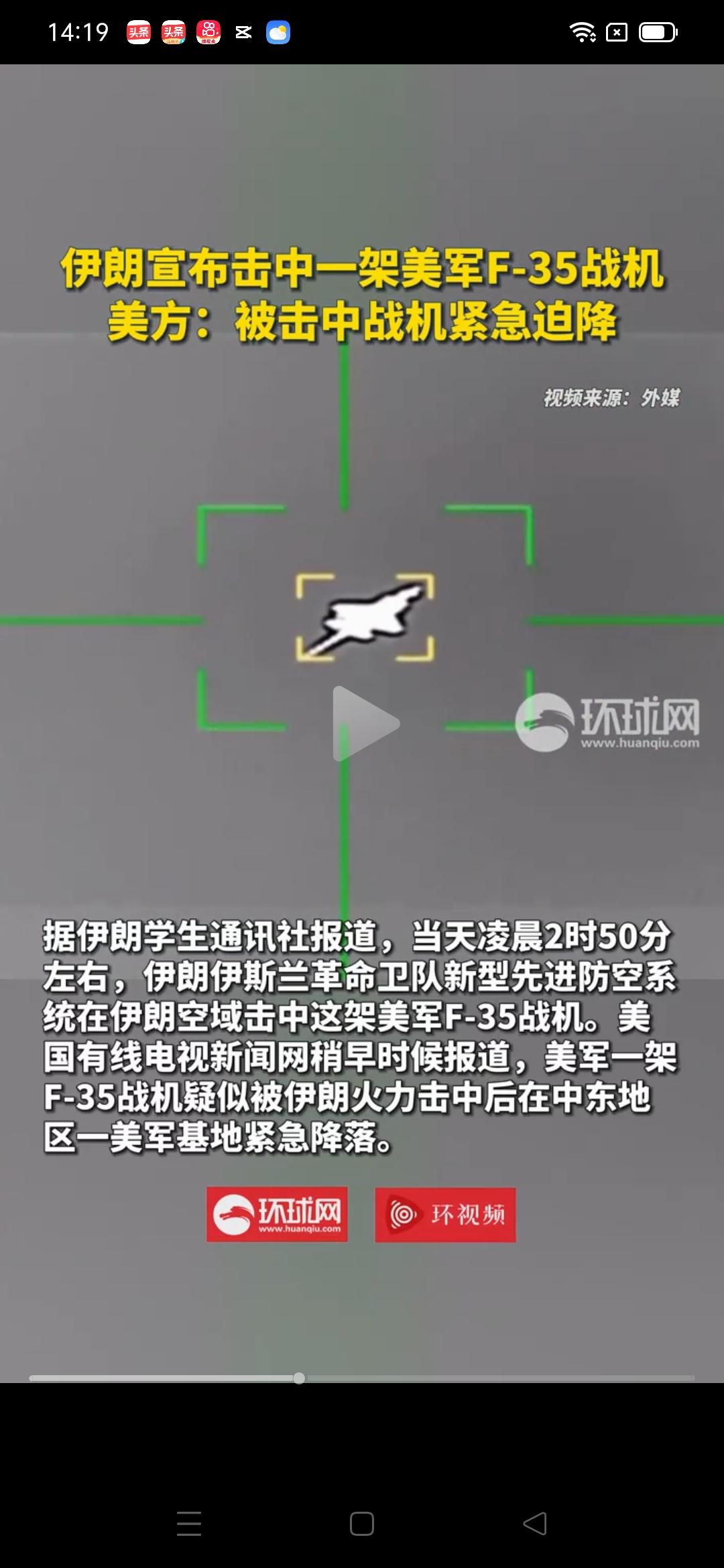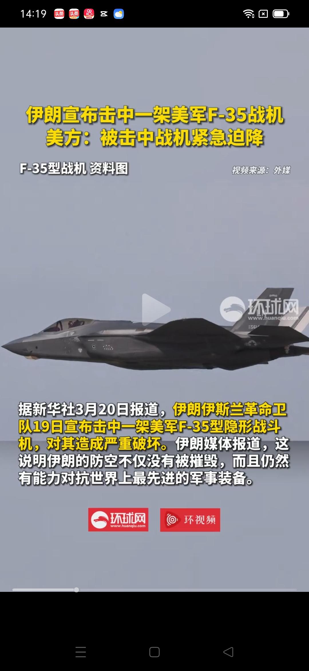 伊朗干了一件惊天动地的大事!被美军吹嘘为未来天空主宰、空中路由器、不败金身、来无影去无踪的美军F35,被伊朗打下来了! 伊朗3月19日称,当天凌晨2时50分在伊朗中部空域用新型先进防空系统击中一架美军F-35战机,造成严重受损,极有可能坠毁。 美军中央司令部确认战机紧急迫降,事件调查中。 为什么F-35被称为“不败神话”? 自2015年服役以来,F-35在叙利亚、伊拉克、阿富汗等实战中从未被击中,多次穿透俄制防空网全身而退,被美军宣传为“不可战胜”。 不可想象,伊朗能把F35打下来,美国惊呆,西方惊呆!这会极大的提高伊朗战胜美以的信心,士气大增。 其实,打掉一个F35比打死内塔尼亚胡,意义更大!因为打掉的是美国世界老大的自信心。 曾经有人说,中美军机如果在南海、东海发生对峙,美军有F35,中国就一定会输,这回不会有人再说了吧。 美国对伊朗空袭 伊朗反击美军 伊朗袭击f35 特朗普当高市面谈珍珠港事件说明啥