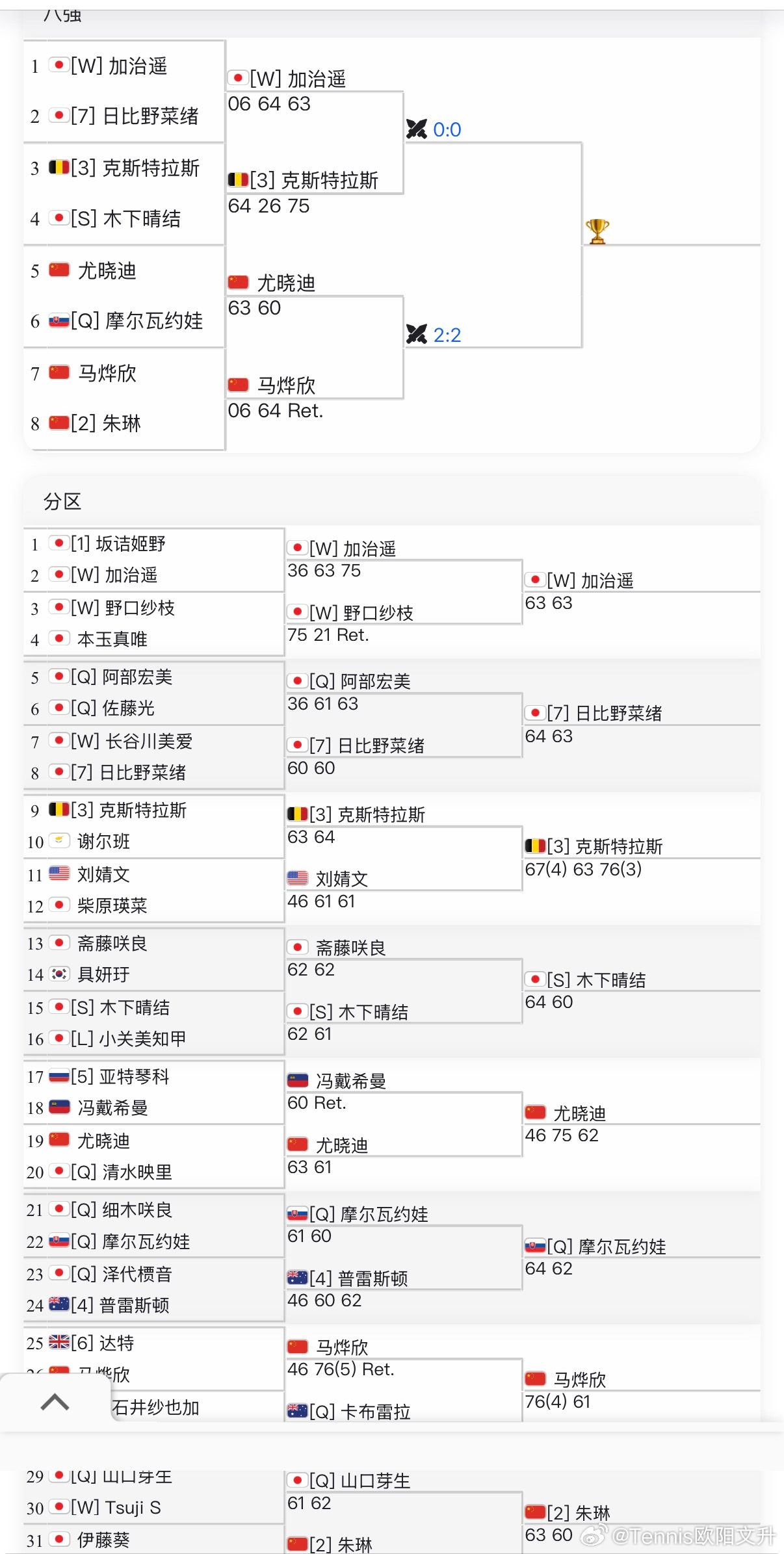 🔵W75甲府女单1/4决赛✅🇨🇳马烨欣0-6/6-4 Ret.【2】🇨🇳朱琳晋级四强即时排名No.165朱琳在决胜盘退赛,希望无大碍