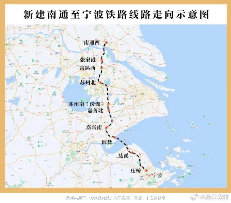 另一条,是正在建设的杭州湾跨海铁路桥。作为通苏嘉甬高铁的关键控制性工程,它是目前世界上在建最长的高铁跨海大桥,气势恢宏,备受瞩目。但细看它的走向,依然是从宁波向北,经嘉兴通往苏州、南通,再接入上海。
