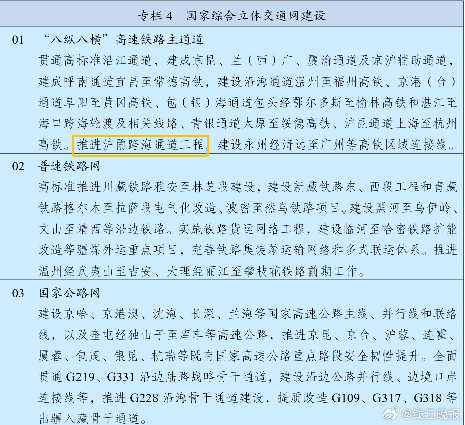 #沪甬跨海通道将成世界最长跨海大桥##超越港珠澳大桥的世界最长跨海大桥#【超越港珠澳大桥,#世界最长跨海大桥要来了#】全长近70公里!一个谋划了10余年的跨海超级工程——沪甬跨海通道,再次进入大众视野。建成后,它有望成为世界最长跨海大桥,比目前世界最长的港珠澳大桥还要长出约15公里。近日,十四届全国人大四次会议表决通过了关于国民经济和社会发展第十五个五年规划纲要的决议,这份宏大的“顶层设计”,在构建现代化基础设施体系中的“专栏4 国家综合立体交通网建设”中,明确提出了要“推进沪甬跨海通道工程”。这意味着,这条横跨杭州湾的“长龙”,从地方蓝图上升为国家谋划,迈入全面规划推进新阶段。“喇叭型”的杭州湾,将上海与浙东南隔开,沪甬两地隔海相望。眼下,横亘在上海、浙江之间的杭州湾,其实已有多条跨海通道,包括服役多年的杭州湾跨海大桥,以及建设中的通苏嘉甬杭州湾跨海铁路桥。杭州湾的大喇叭口再往里,还有嘉绍大桥等。那么,为何要再谋划一条跨海通道?沪甬跨海通道的建设又有着怎样的特殊意义?