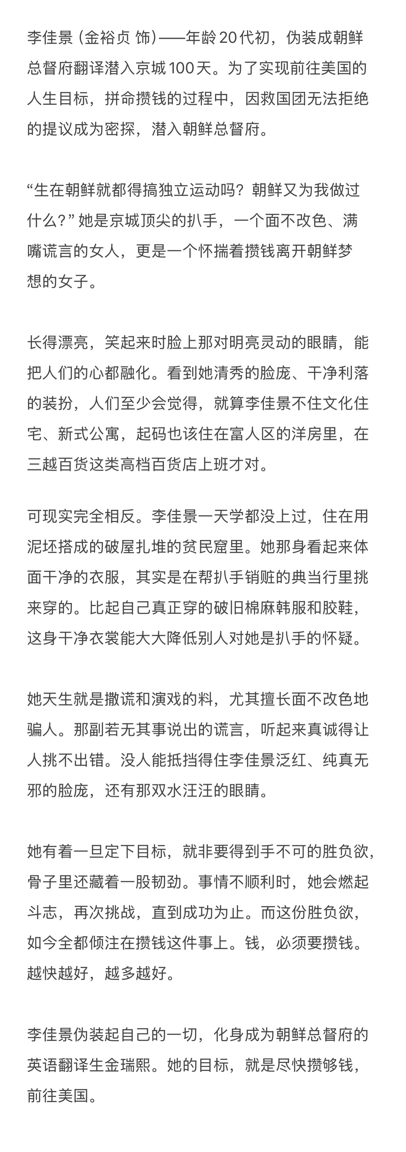 图1李佳景(金裕贞 饰)——顶尖扒手,满嘴谎言的女人,没人能抵挡得住她纯真的脸庞和那双水汪汪的眼睛。为了攒钱去美国,伪装成英语翻译潜入总督府当密探