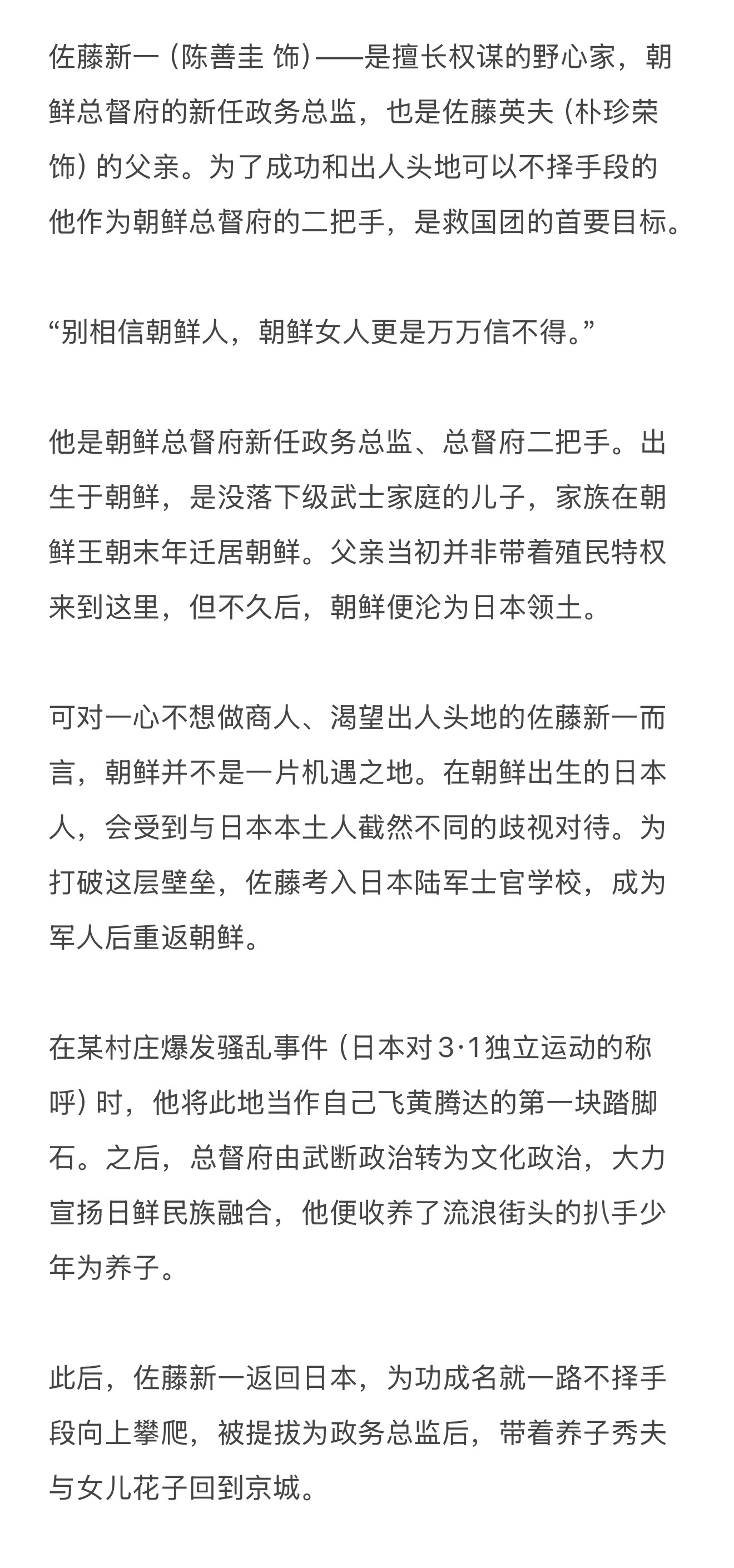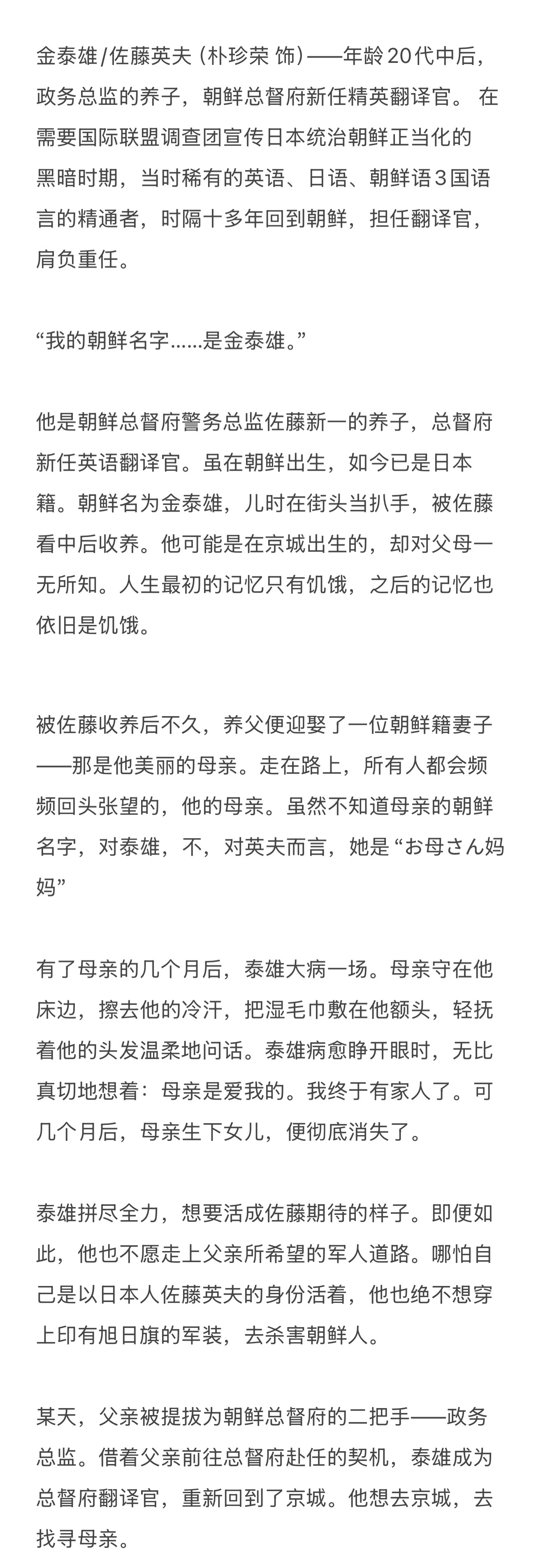 图2 金泰雄/佐藤英夫(朴珍荣 饰)——被日本人收养,在总督府当翻译,精通英日朝三国语言
