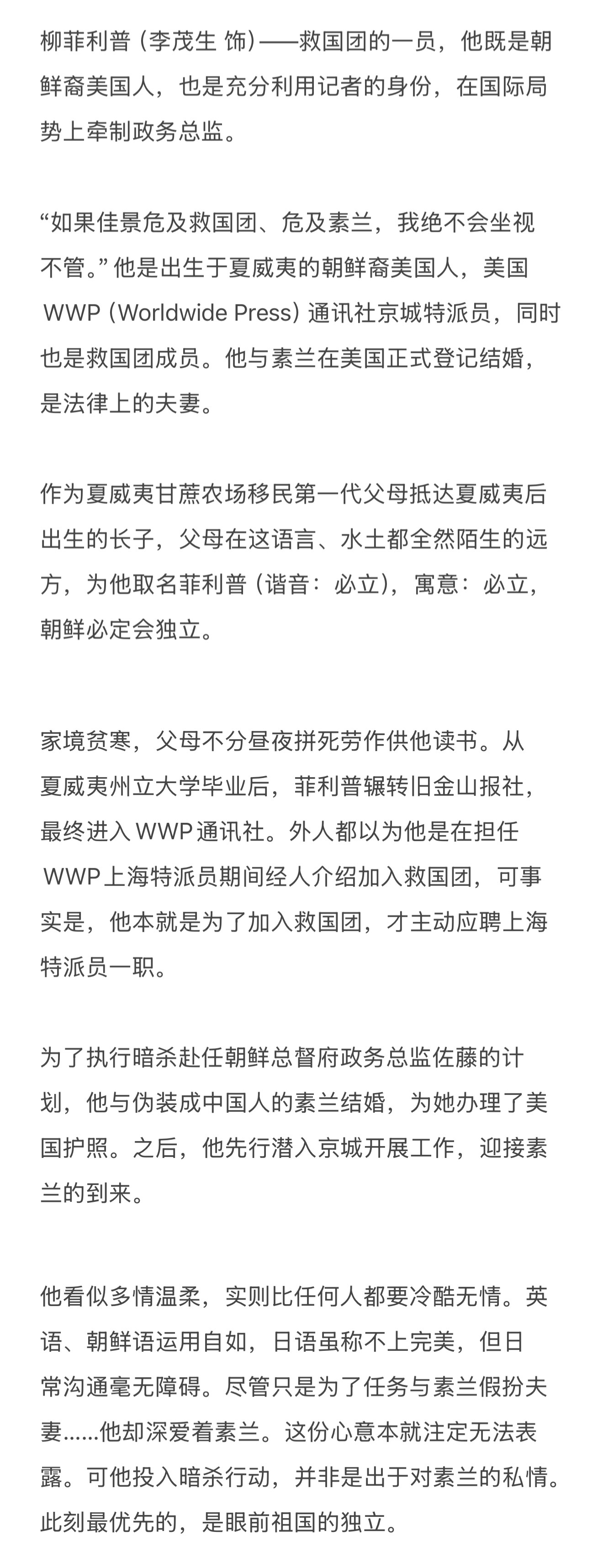 图4 柳菲利普(李茂生 饰)——救国团成员,牵制佐藤新一。虽然和柳素兰(金贤珠 饰)是名义夫妻,但深爱着她