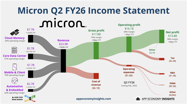 全球第三大内存巨头美光日前也发布了业绩炸裂的财报,截至2月26日的Q2财季营收同比增长将近两倍至约239亿美元,非GAAP口径下调整后每股收益(EPS)12.20美元,均明显高于市场预期。