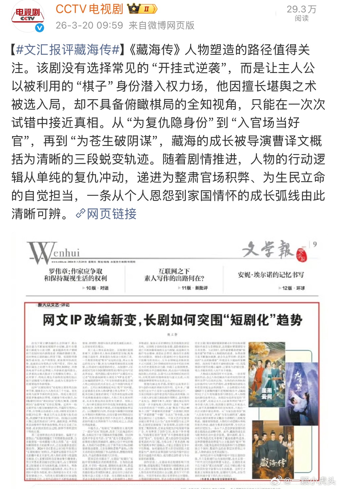 文汇报评藏海传藏海传能大胆的跳出俗套的“金手指”复仇爽文模式,从剧情厚度里重点突出人民史观,从敌人的复仇带出整个朝代的腐败和权力制度!藏海从小百姓成长为传奇人物,他聪明,专心,他要固恨,要学习,要钻研,要谨小慎微,要抛弃尊严,抛弃一切,要赌上性命!这一切的一切往往绕不开人性的复杂,《藏海传》里那些因为人心摇摆而扭转的局面,才是最精彩的看点!