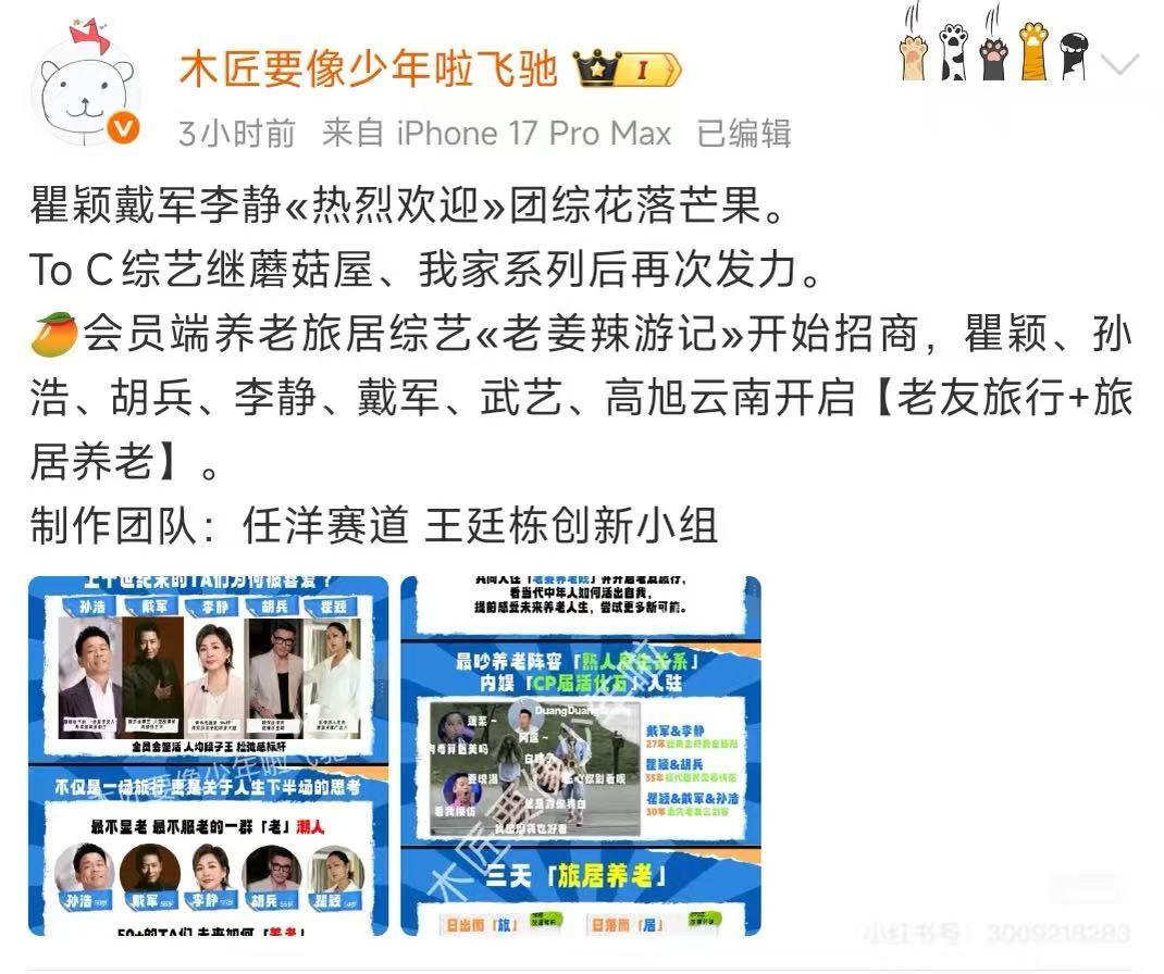还得是芒果台嗅觉最灵、下手最快!瞿颖、胡兵、李静、戴军刚凭松弛感翻红刷屏,平台立刻光速打包,把这几位 90 年代内娱顶流直接凑齐成团综,新节目定名《老姜辣游记》。 初代超模、国民主持天团、乐坛老将梦幻合体,堪称内娱活化石世纪同框!节目主打夕阳红老友局,一起沉浸式体验养老旅居,光是阵容就已经拉满情怀与笑点,坐等这群老江湖互怼整活,绝对要爆!