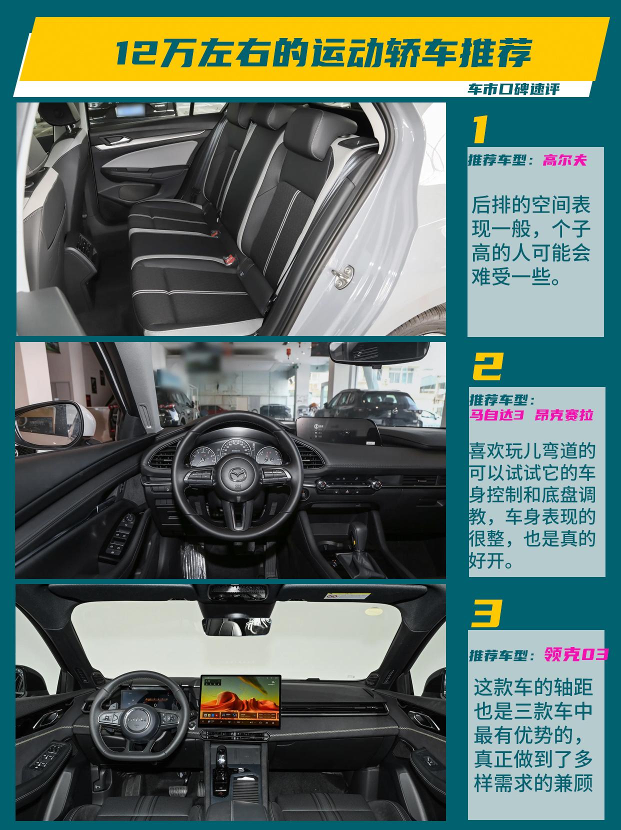 刚毕业的年轻人,想十二三万想买辆运动家轿,高尔夫、马自达3 昂克赛拉、领克03这
