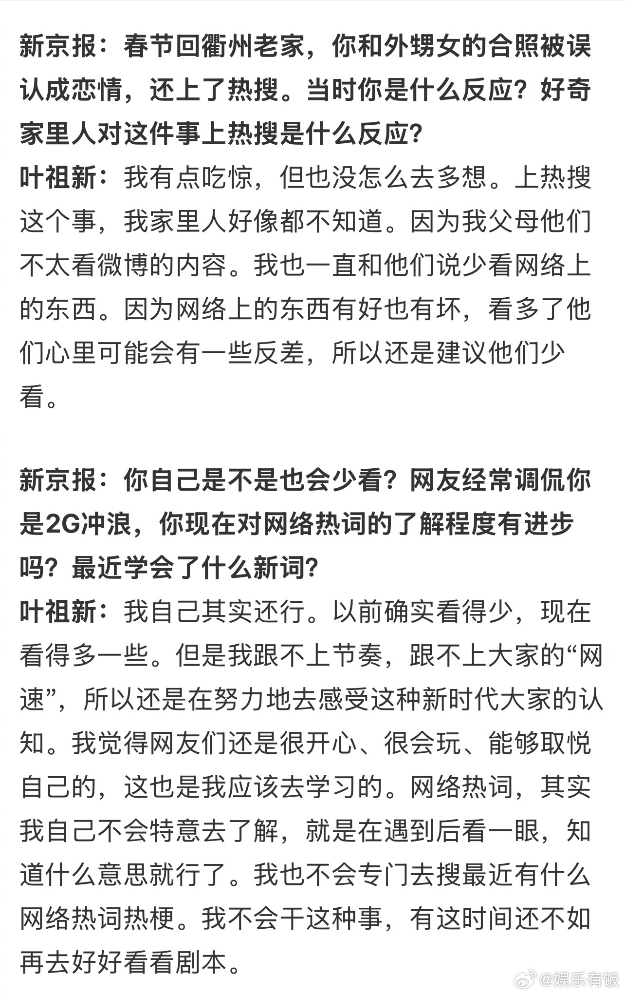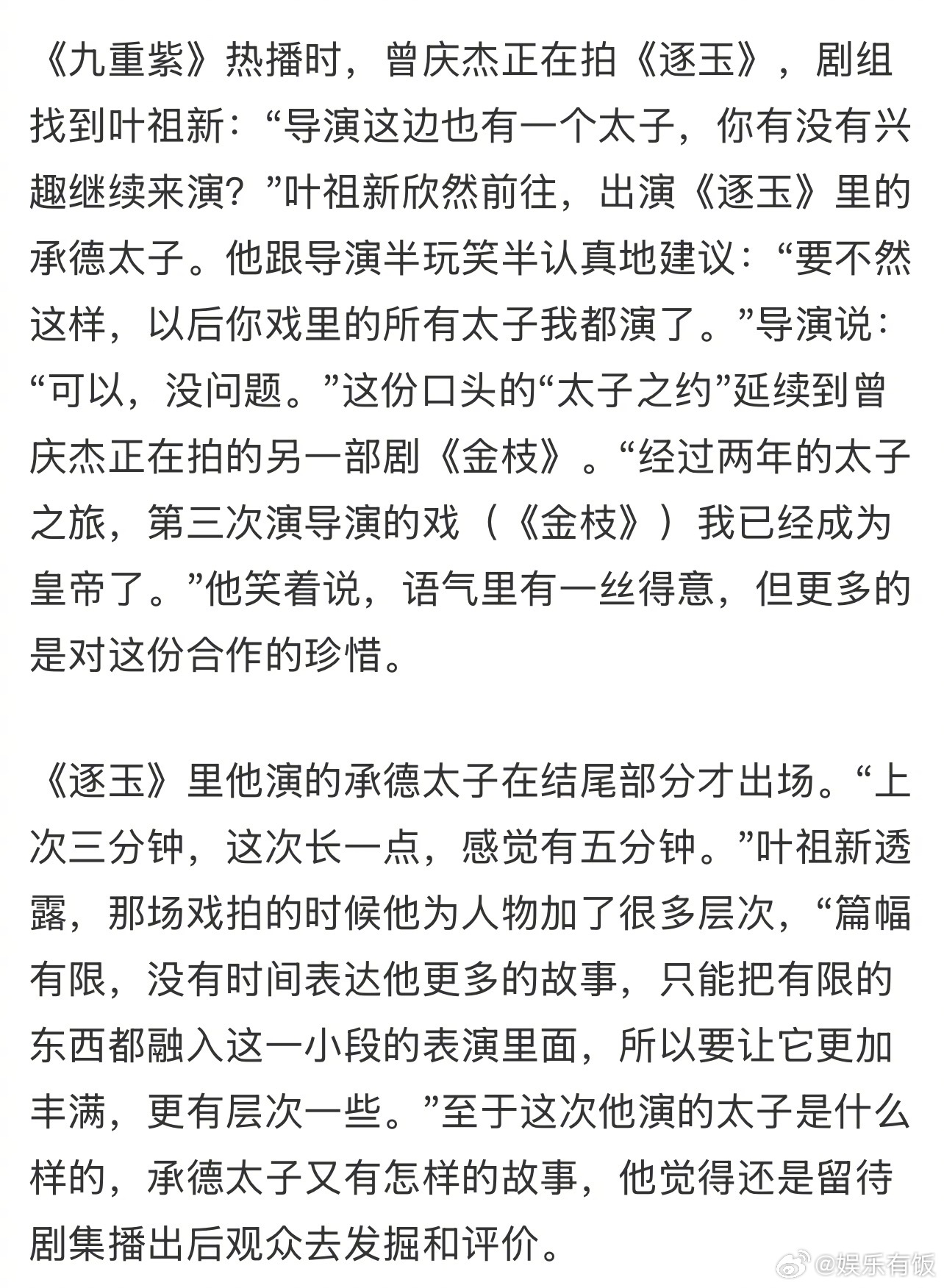 叶祖新在曾庆杰宇宙里登基叶祖新回应被网友误会官宣恋情 在新京报专访中,叶祖新分享了与导演曾庆杰的合作历程:从《九重紫》到《逐玉》,他接连饰演太子角色,并与导演定下“太子之约”,最终在《金枝》中升级为皇帝,完成了在导演作品宇宙里的“登基”。谈及角色塑造,叶祖新表示会在有限篇幅里为人物注入更多层次;对于“叔圈天菜”的标签,他坦言自己只是踏实演戏的普通演员;针对此前与外甥女合照被误认恋情的热搜,他称自己并未过多在意,也叮嘱家人少受网络信息影响。此外,他还提到《九重紫》是其职业生涯的重要转折点,并感谢过往沉寂期带来的成长。