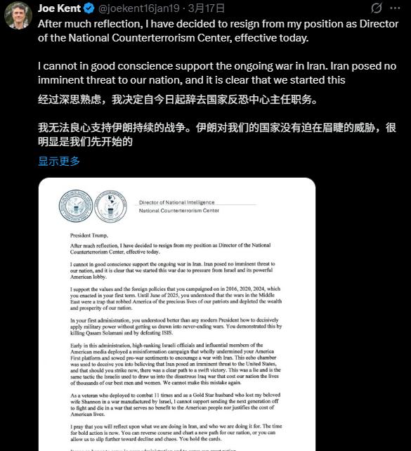 “美国要玩完了!” 刚辞职就被调查,3月19日,刚辞职的美国前国家反恐中心主任乔·肯特在塔克·卡尔森节目上直接回应他目前面临的“泄露机密信息”刑事调查。 肯特的身份不一般。作为特朗普时期任命的反恐中心主任,他有着丰富的军旅经历,还数次亲自赴前线实战。无论从专业度还是话语权来说,他的意见都不该被轻易忽略。但恰恰是他这一份坚持专业判断和道德立场,反倒成了被当做“不稳定因素”的理由。 肯特在辞职信里没有留情面,直指所有可靠情报显示,伊朗并没有对美国构成直接、紧急的威胁,发动伊朗战争背后则是外部游说集团的长期操作。这一说法直接挑战了白宫的公开立场,也让美国的官方理由显得很苍白。 站在外人角度看,肯特好像是那个敢于对抗群体压力的人。然而,美国高层对此却很不高兴。特朗普发文批评他“在安全上太软弱”,觉得肯特的离开没什么损失。 肯特的举动不仅戳破了官方宣传的那层薄纱,更点燃了外界对美国决策机制的信任危机。明明是反恐情报头子,真实情况却被政治叙事推到对立面。这种操作,倒像是自己和自己较劲。 紧接着的调查显得更加微妙。辞职才隔了一天,司法部门就让肯特接受泄密调查。外界很快猜测,这是不是想用法律手段安静掉异见。 肯特在热门脱口秀节目上则干脆点破,他公开了自己曾试图调查查理·柯克遇刺案时,发现有人死命阻止他和团队往深里查。柯克在遇刺前表达过强烈反对伊朗战争的意愿,这本该是一起敏感案件,但肯特团队却被命令不得继续探究,理由并不透明。 这背后反映出来的问题是,美国政治圈内对待异见的容忍度变得极低。专业判断和理性声音常常被挡在门外,真正参与决策的往往只是一小撮能影响总统的人。 肯特说,战争决策前关键会议并没有展开真正的交流和辩论,很大程度上,反对意见被有意压制。有人认为,这简直是公开承认美国政策正在走“黑箱操作”,而不是集体和公开讨论。想让不和谐的声音消失,比让真相大白更容易。 肯特把美国政策重点推到“以色列游说集团”身上,也让白宫感到压力山大。美国政坛向来避讳群众公开讨论游说集团问题,更别说把这当作战争发动动因。 肯特的爆料被马上贴上了政治不正确的标签。官方回应他的言论不靠谱,部分舆论甚至把他描述成带有反犹色彩的边缘人物。这一系列操作其实暴露了华盛顿的尴尬:一边打着“美国优先”的旗号,实际却让外部因素牵着鼻子走。 更让人头疼的是,内部文件显示美以双方对于伊朗战争的最终目标根本不是一码事。美国的目的只想遏制伊朗的军事能力,而以色列则意在改变对方的政权根本。 不仅如此,战争带来的副作用马上殃及普通民众。油价持续跳涨,化肥价格攀升,经济影响落在了美国老百姓头上。这和当初政客们许诺的“让美国人自己获益”背道而驰,社会怨气也跟着滋生。 肯特事件把美国体制的问题放到了聚光灯下。情报界的专业判断一次次被用来服务于政治目标,异议分子遭到打压,政策形成过程中透明度几乎为零。 信任危机不仅局限于大众舆论,还扩散到部分官方机构。连参议院情报委员会的老资格议员也不得不承认,他们没看到伊朗构成直接威胁的有力证据。这种情况下,政府怎么让民众还有信心? 从肯特本人的命运延伸开来看,美国政治体制的自纠能力正在削弱。当一个说真话、做实事的高层官员变成被调查的“敏感人物”,体制自身运作和错误纠正能力不但是在下滑,还失去了本该有的空间。 肯特的这句“美国要玩完了”,说得其实很直白。美国眼下并不会因此崩塌,但假如自己将真相和良知都关进小黑屋,那么“大厦根基不稳”也就是早晚的事。毕竟,历史从来不会原谅那些把问题扫进地毯下的政府。 肯特事件提醒所有人,吹哨人的下场反映着体制健康与否。当一个国家连批评和反思都成了“违禁品”,不管其军力有多强、经济有多大,未来的失控或许只差临门一脚。真正的风险,不在于外部的敌人,而是内在的沉默和回避。