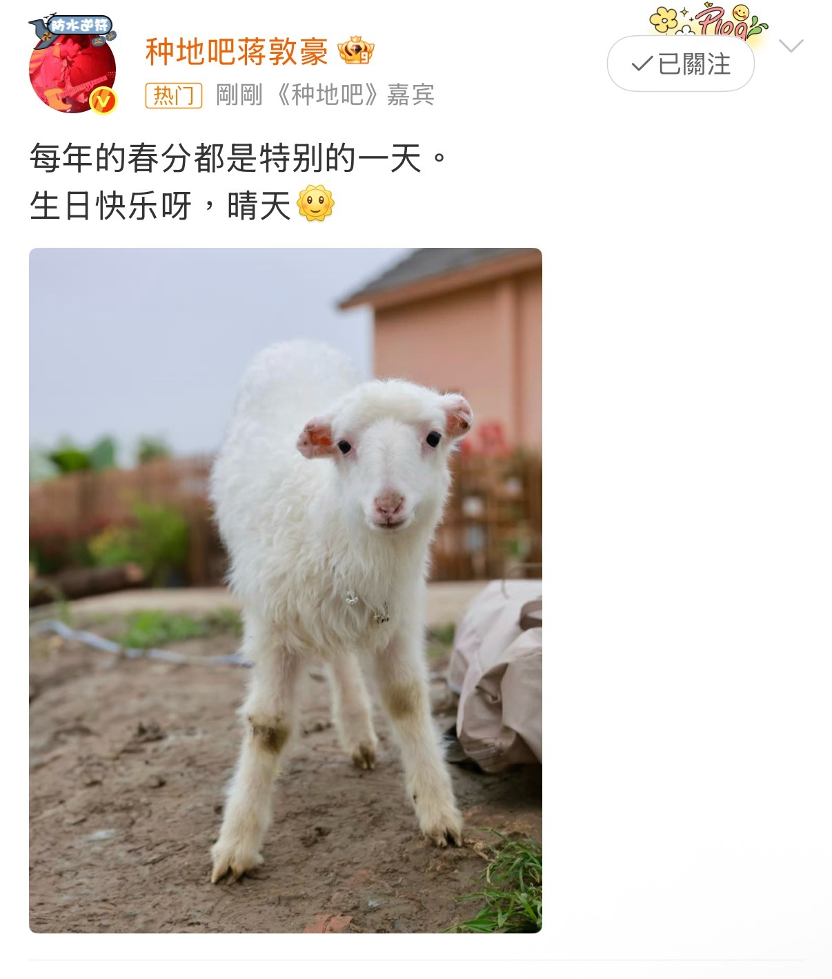 蒋敦豪每年的春分都是特别的一天每年的春分都是特别的一天,生日快乐呀我们小羊仙官晴天蒋敦豪生日快乐呀晴天种地吧
