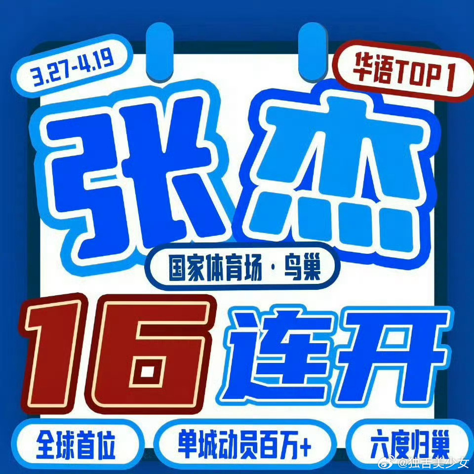 张杰张杰鸟巢站加场 3月20日官宣!张杰鸟巢演唱会从12场扩至16场,4月6日-19日连唱。门票曾80秒售罄,华语乐坛纪录再被刷新。张杰鸟巢16场连开