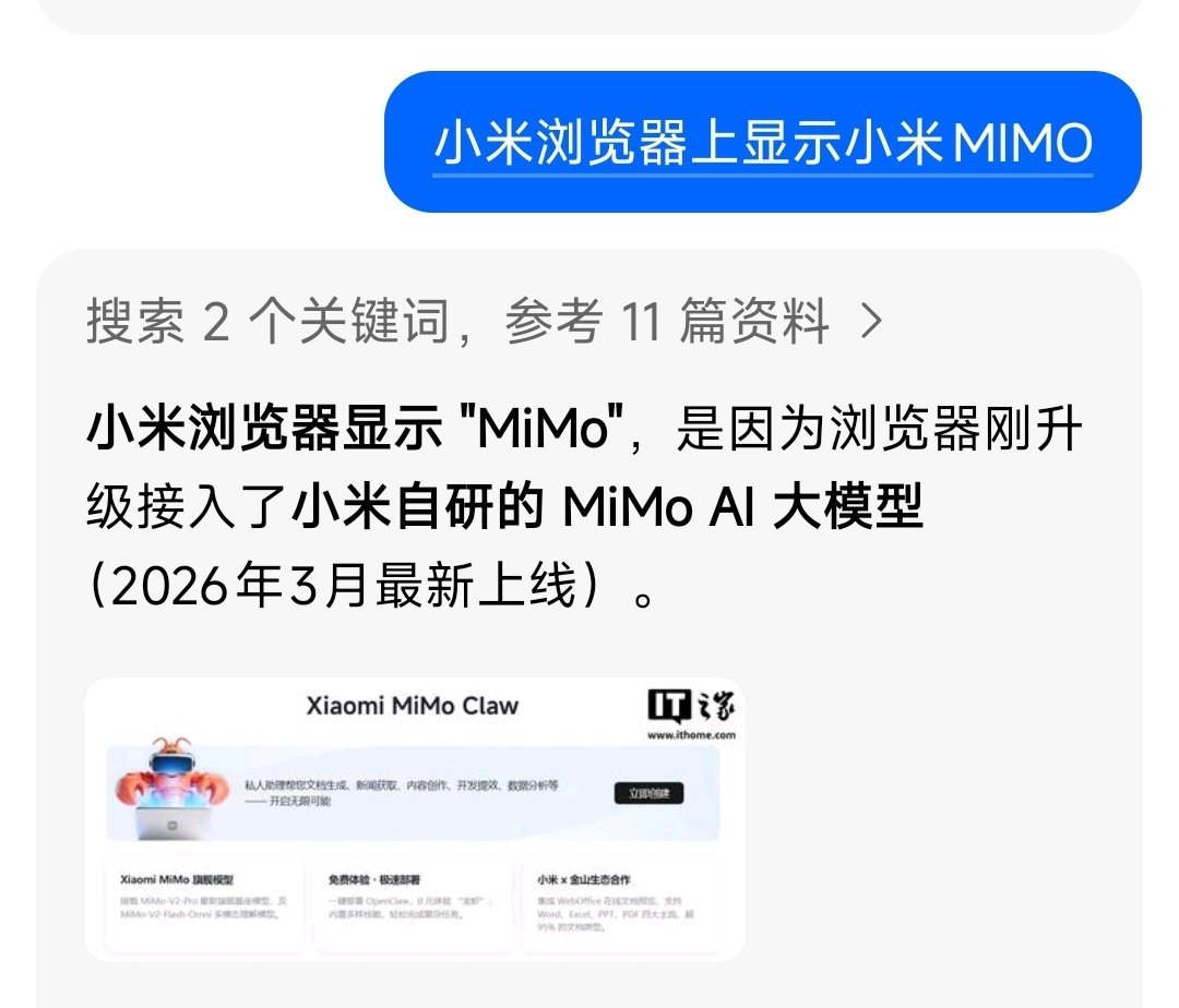 手机上浏览器多了一个小米MIMO的标!主题选的是无字的!搜索了豆包,原来是浏览器接入了MiMO AI大模型!