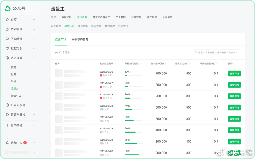 2.公众号互选广告全新上线「招募任务」模式,加上之前的原创定制、供稿直发、种草合集、图片消息 ,为创作者带来更多变现机会。公众号官方提示在该模式下,受邀创作者可以在“微信公众平台 - 收入变现 - 流量主 - 互选任务 - 招募任务”中查看广告主发布的任务,并根据自身内容特色自主报名参与,以“阅读单价”结算收入。