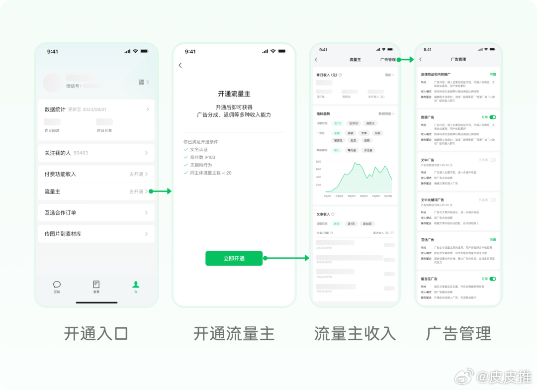 1.公众号程序化广告开通条件优化,公众号程序化广告开通条件由“粉丝数 ≥ 500”调整至“粉丝数 ≥ 100”。微信广告提示,符合条件的创作者可登录“微信公众平台”,进入“收入变现 - 流量主”页面,开通流量主功能,选择开启公众号程序化广告,获得广告收入。