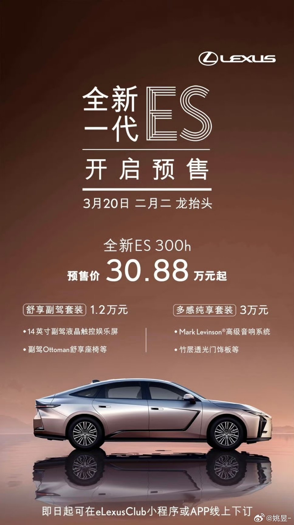全新雷克萨斯ES 价格来了预售价30.88万元起副驾娱乐屏+舒享座椅1.2万元马克莱文森音响+竹木饰板3万元后续也会有纯电车型这个价格你们觉得合适吗?全新一代ES依然ES超越ES