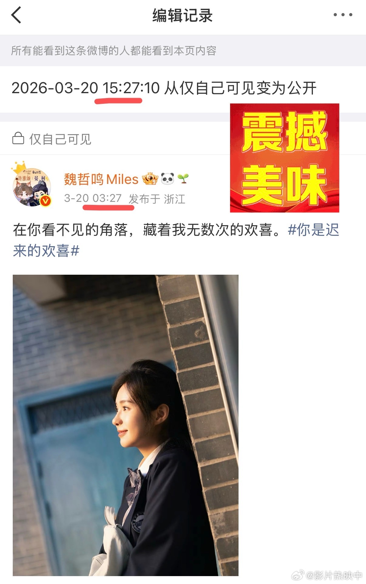 魏哲鸣凌晨私密转公开夸爆魏哲鸣的剧宣思路🌟居然用私密转公开的方式发内容,还统一卡点3:27,这种小巧思真的很特别😜你是迟来的欢喜