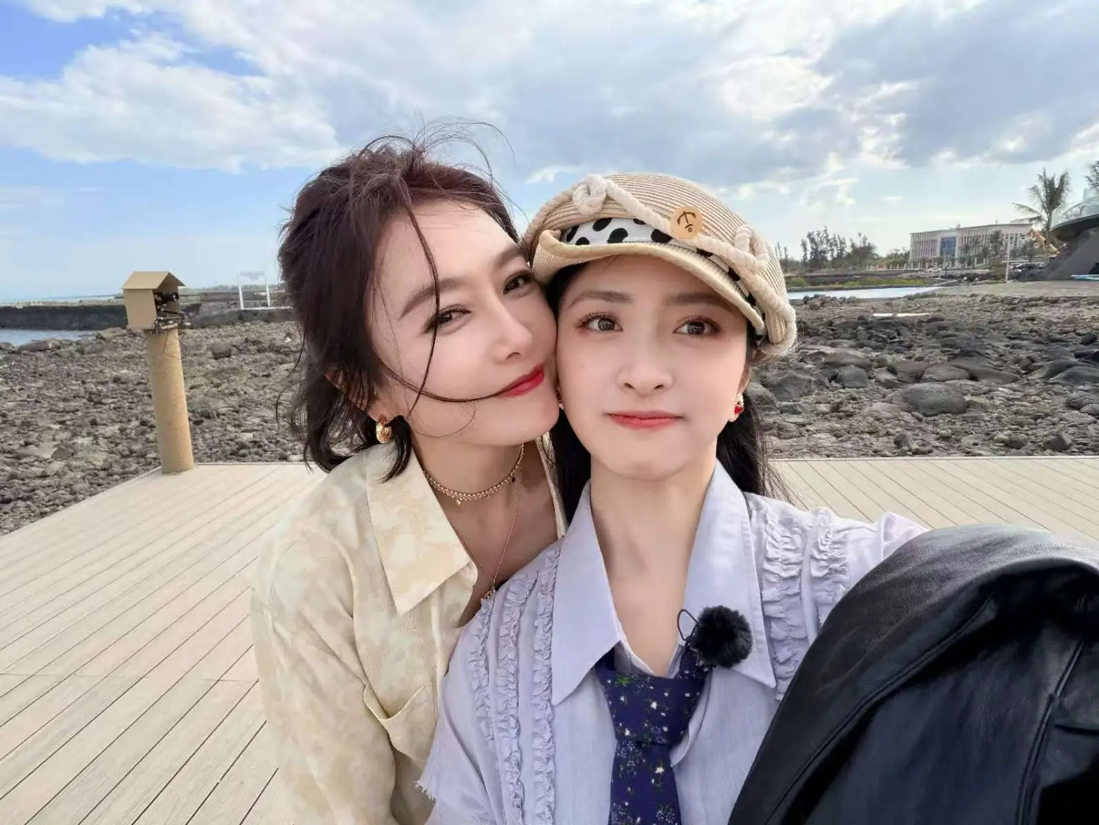 沈月与秦岚亲昵互动贴脸自拍 海边嬉闹松弛又活力