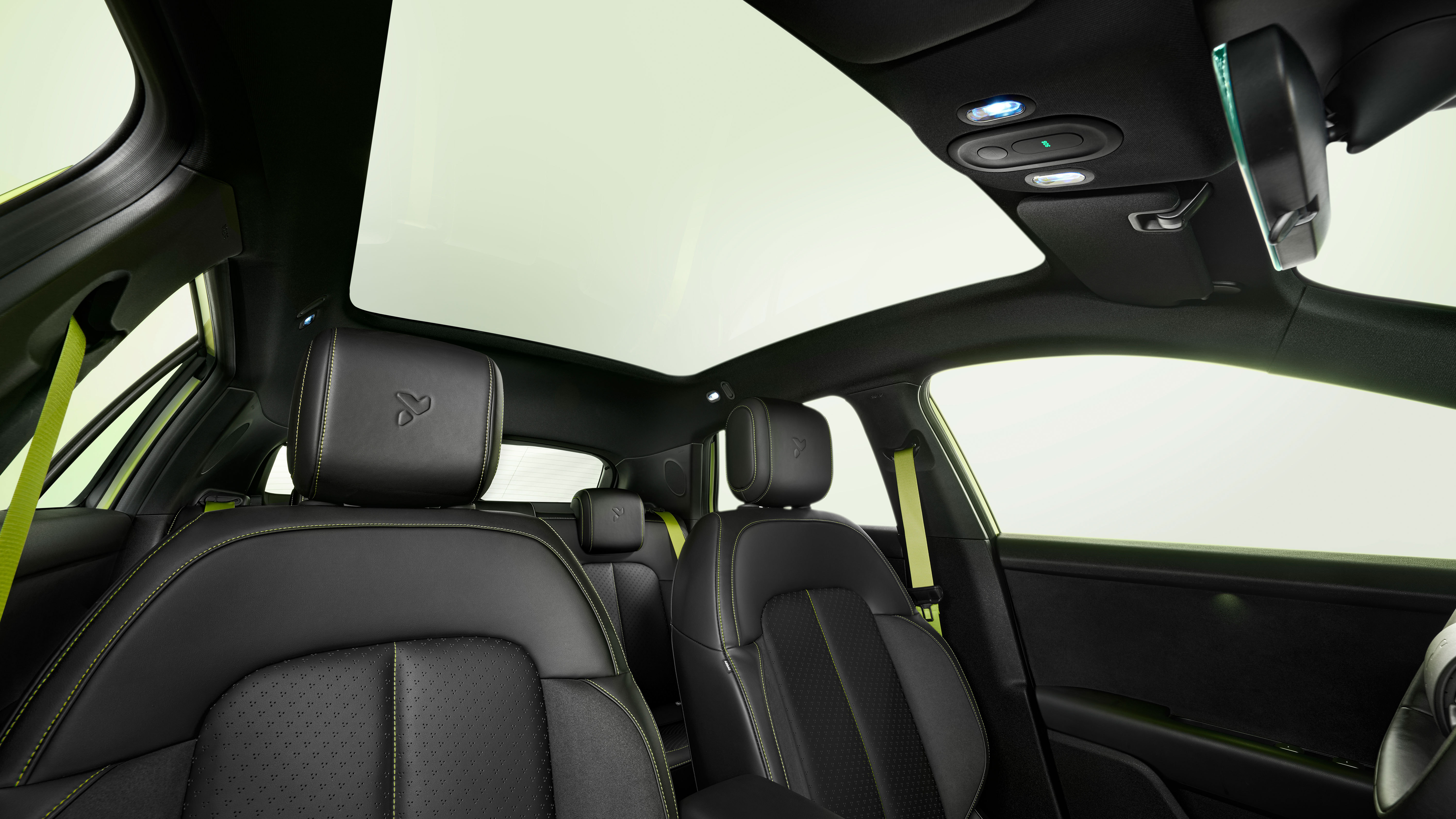 新生绿配霓虹紫,荧光撞色直接把复古未来时尚感拉满,昼白轮圈复古又机能,加上专属同色内饰套件,头枕凸印、荧光缝线细节拉满,整个座舱都是千禧潮流feel。