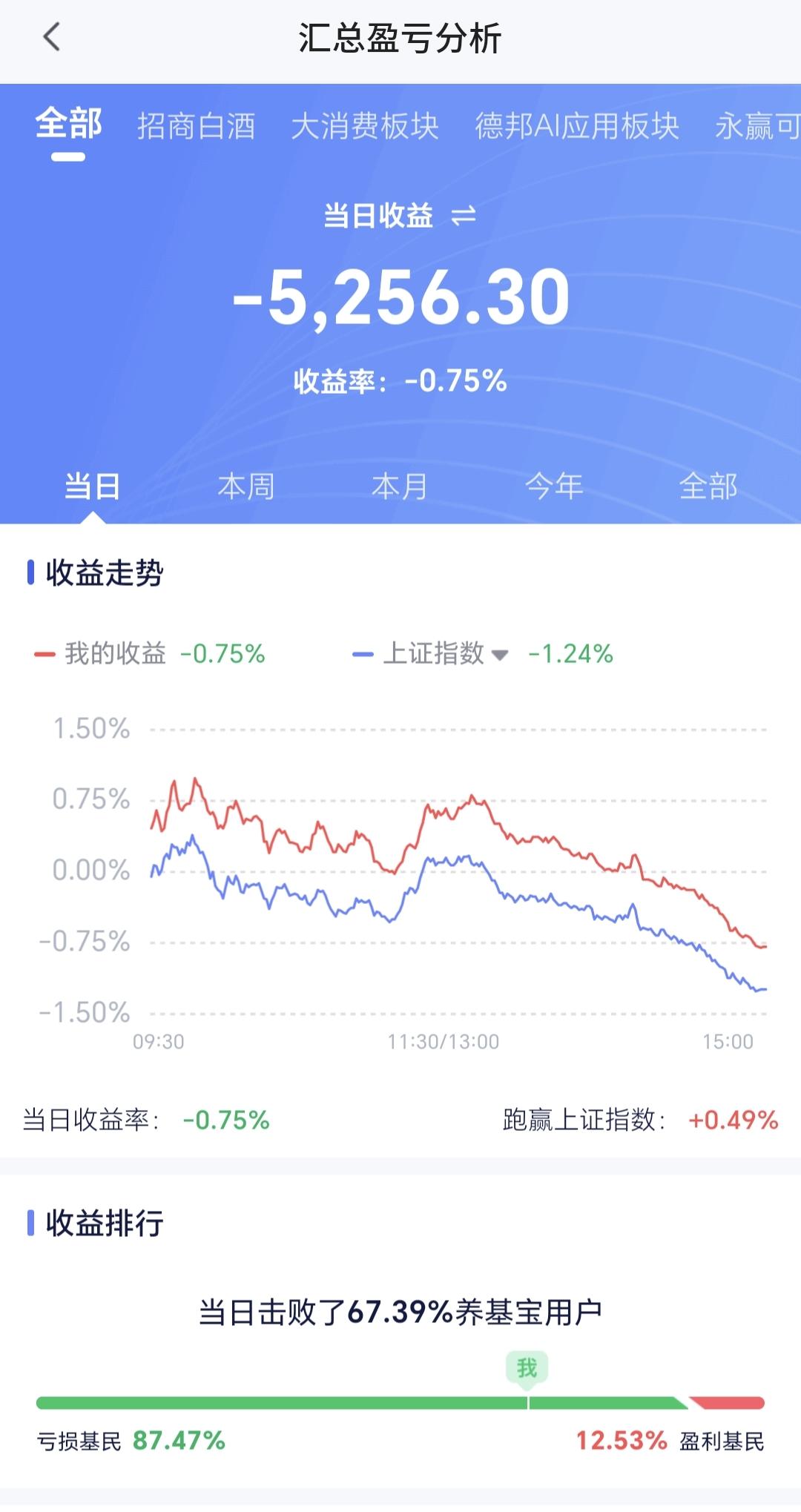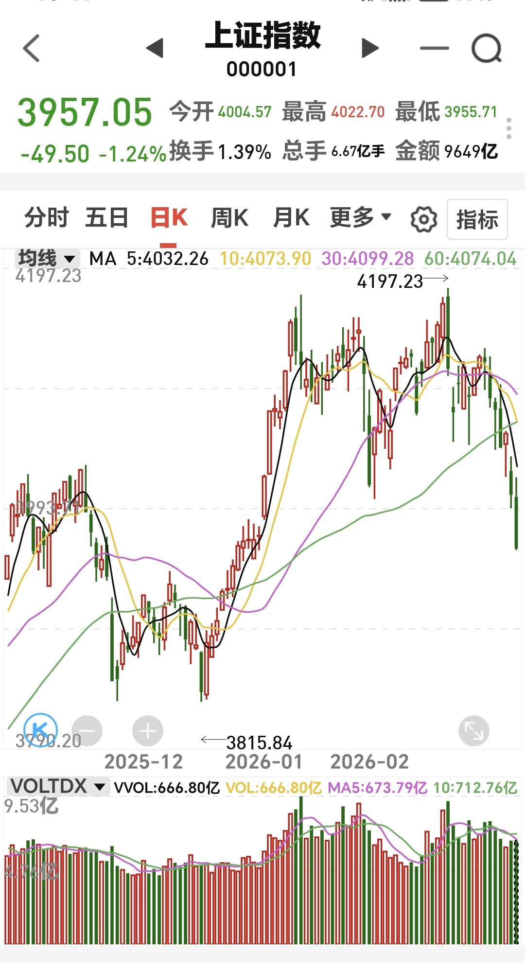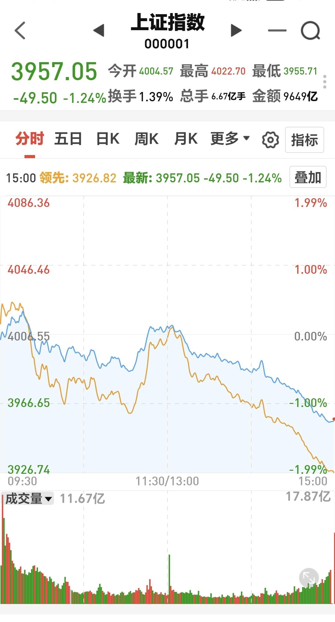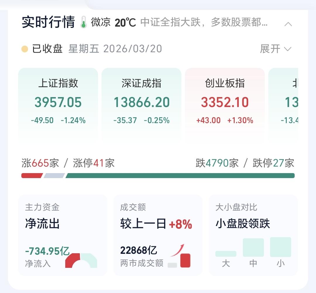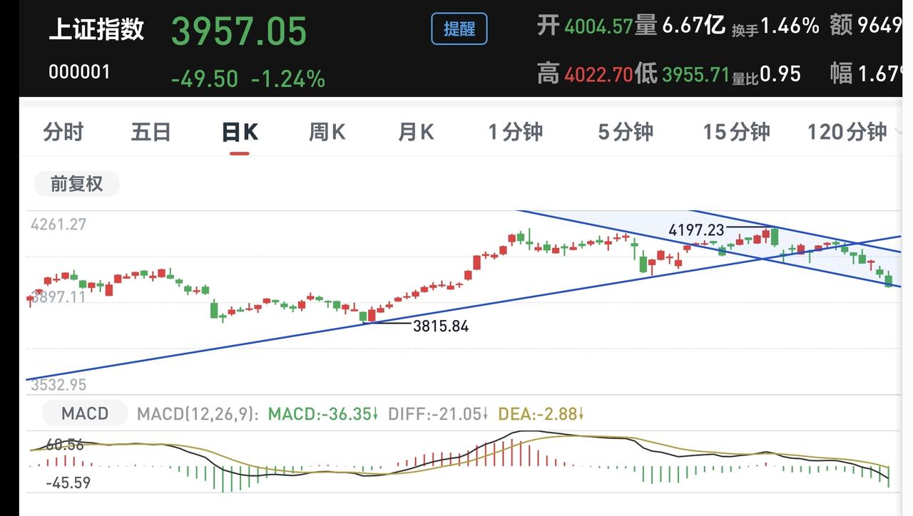 基金:控制好仓位,随时随地准备进场 今天市场冲高回落,下午是一个单边震荡向下的过程,盘中连一个像样的反弹都没有,收盘的时候指数涨跌不一,创业板指上涨,上证指数和深成指下跌,创业板指上涨了1.30%,收于3352点,上证指数下跌了1.24%,收于3957点。 今天绝大部分时间都是黄色线在蓝色线下方,这也是今天冲高回落的主要原因,两市累计成交22868亿,相比昨天放量了8%,上涨家数600多家,下跌家数4700多家,下跌家数大幅度超过了上涨家数,涨停41家,跌停27家,主力资金净流出734亿。 看下面的截图4,这是上证指数日K线图,最近一段时间上证指数都是在日线级别短期下跌通道内震荡,今天的下跌来到了这个短期下跌通道下轨线附近,在这里随时随地有反弹,但只要反弹不能突破这个下跌通道的上轨线,反弹结束以后都还会继续下跌。 看下面的截图5,这是上证指数周K线图,上证指数周线级别处于上涨通道内,最近一段时间的下跌来到了这个上涨通道下轨线附近,这条下轨线有一定的支撑力度,但如果跌破这个下轨线,震荡调整会向纵深发展。 前几个月市场一直是在横盘震荡,最近两天的下跌基本上确定是方向选择了向下,今天跌破了3977至3983点的缺口,下一个支撑在3880点附近,但下跌阶段也不是每天都下跌,即使能够到达3880点,也会是震荡式下跌到那里,如果周末没有幺蛾子,下周初还是会有反弹的,是到时候要看反弹的力度和有没有资金进场,反弹力度弱,或者是反弹过程当中没有资金进场,反弹结束以后就会继续下跌。 持有基金现在盘中估值亏损了5256元,盈利金额最大的三个板块是:创业板指,新能源汽车板块,5G板块,亏损金额最大的三个板块是:证券板块芯片,半导体板块,先进制造板块。 很多人想不通最近的下跌,我不知道前段时间18连阳的时候,他有没有想通,你能够想通18连阳,你为什么不能想通这里的震荡调整,何况,这里的调整到现在为止还是小级别的震荡调整,真正的下跌是飞流直下3000尺,我们防的其实就是那样的下跌,防守的过程中没有下跌,我们纠错买回,防守的过程中,防守对了,我们就抄底进场,这就是我们一直不变的策略。 周末的时候还要注意消息面,最近外围局势不稳,消息面对我们走势的影响很大,但这些都是我们不能把控的,我们能把控的就是自己的操作策略,做到涨不喜跌不忧,做到坦然面对市场的涨跌,控制好仓位,随时随地准备进场,下一篇文章讲:在随时随地准备进场之前,我们需要做哪些准备? 花1秒钟点赞,花30秒钟评论,就是对我最大的支持,谢谢大家的支持。