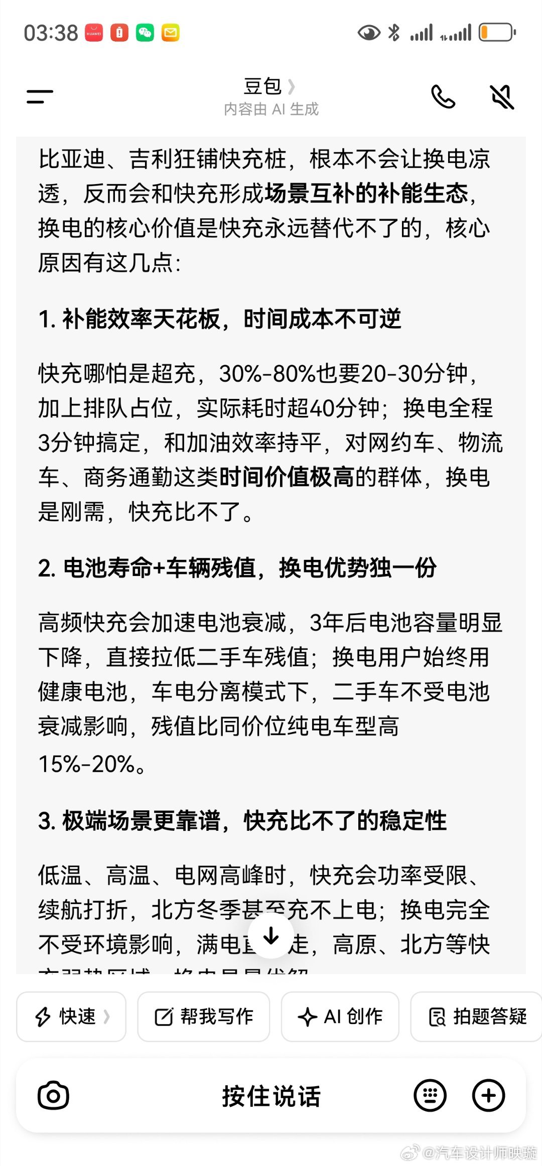 我问AI:比亚迪和吉利都搞兆瓦闪充,蔚来的换电是不是凉啦,它给我一堆理由....