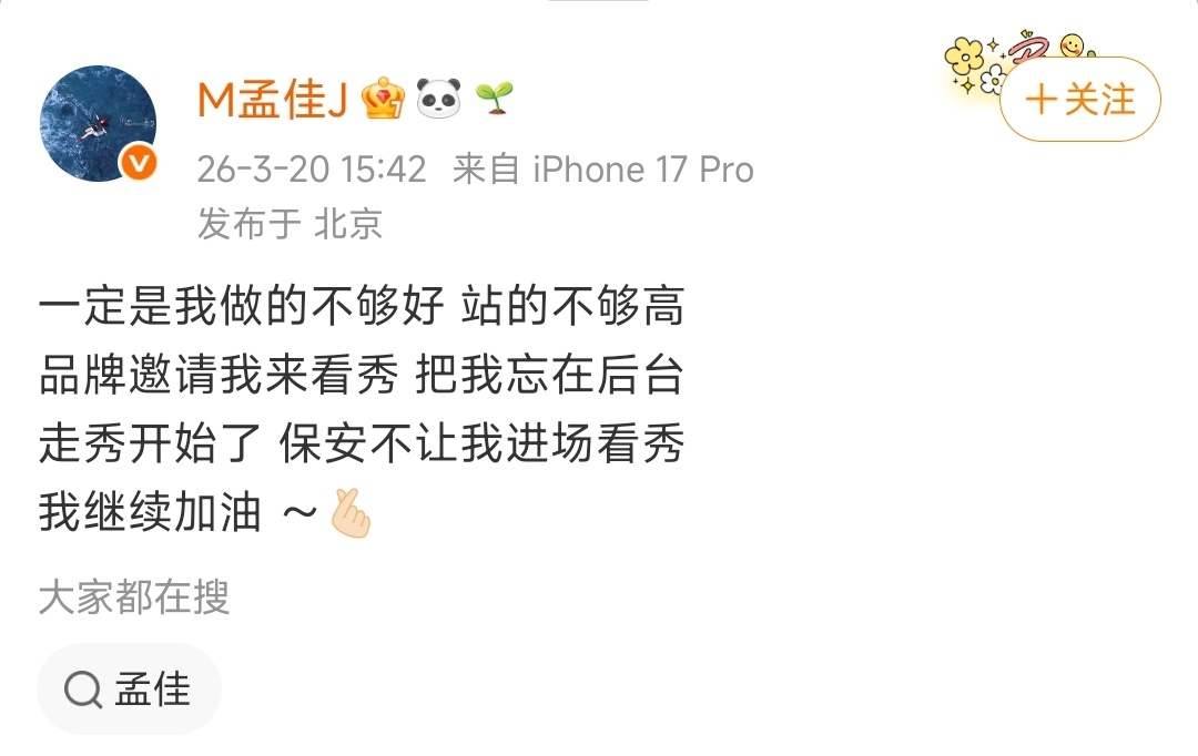 顶级“职场PUA”现场。品牌方亲自发邀请喊孟佳来看秀,结果转头就把人彻彻底底忘在后台。走秀都开场了,保安大哥还一本正经拦着不让进,合着人家是来当后台布景板的是吧?最绝的是孟佳还得自我调侃:“一定是我做的不够好,站的不够高”,最后还比耶说“我继续加油~”这哪是艺人不够优秀啊?明明是品牌方的记性比鱼还短,待客之道碎得稀碎。邀请的时候甜言蜜语,转头就把嘉宾当空气,这操作比临时跑路的网红还没谱。保安也是“尽职尽责”,连正经受邀嘉宾都能拦在门外,这执行力不去守球门都可惜了。还好我们孟佳心态稳,就算被怠慢也不撕破脸,反而用自嘲给足对方面子,这格局直接把品牌方的不专业衬得明明白白。