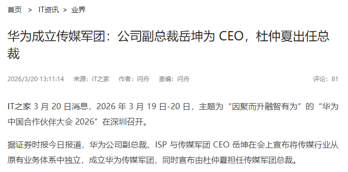 据证券时报今日报道,华为在会上宣布将传媒行业从原有业务体系中独立,成立华为传媒军团。华为副总裁、ISP 与传媒军团 CEO 岳坤现场发布该消息,同时宣布由杜仲夏担任传媒军团总裁。
