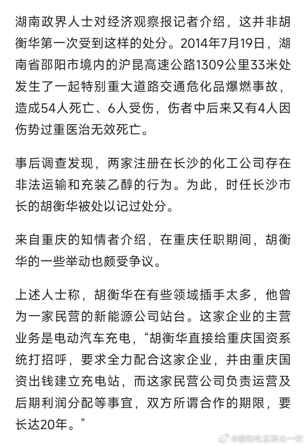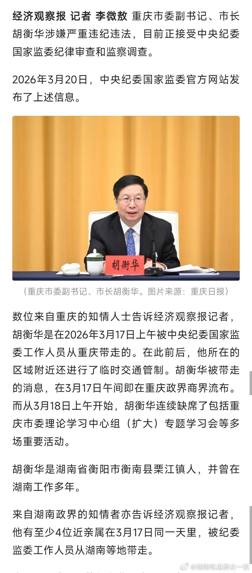 重庆市长胡衡华被查重庆市市长胡衡华被查,其4名近亲属亦被带走。(来源:经济观察报)