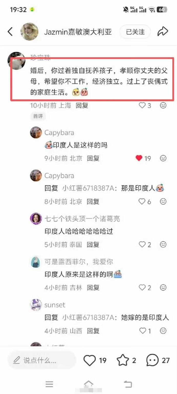 这个案例真的太典了:一女子阴阳怪气澳大利亚女网友晒的中国男友,结果网友打开她的主页,发现她竟嫁了一个印度人,纷纷嘲笑她的丧偶式生活…[笑哭][笑哭][笑哭] 印度博主游中国 外网奇葩 年度澳大利亚人