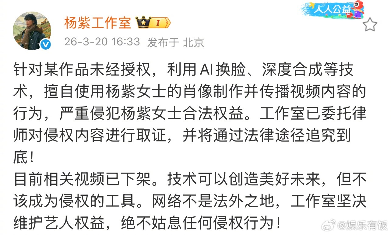 杨紫方追责AI换脸侵权杨紫工作室起诉AI换脸侵权 3月20日,杨紫工作室发布声明,针对某作品未经授权,利用AI换脸、深度合成等技术擅自使用杨紫肖像制作并传播视频内容的行为,表示该行为严重侵犯艺人合法权益。工作室已委托律师对侵权内容完成取证,并将通过法律途径追究到底。目前涉事相关视频已下架。声明同时强调,技术不应成为侵权工具,网络并非法外之地,工作室将坚决维护艺人合法权益,绝不姑息任何侵权行为。