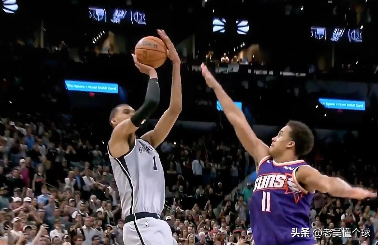 从普拉姆利的眼神就能看出,文班亚马球队老大的地位有多么的不可撼动。 这样的准绝杀,无异于压哨绝杀,因为太阳没有暂停了,时间仅剩1秒钟,相当于一击致命的投篮。 文班亚马这个绝杀球集齐了一切的条件,首先是太阳前面的两罚不中,马刺维持了1分的落后,只需要一个两分就能绝杀掉比赛,其次是太阳的防守,让文班接球太容易了,也没有上包夹,而且接到球后,直接就落在了中距离上,只要文班亚马拔起来,对方是不可能干扰得了他的出手的,加上文班亚马今天的中距离是有投进过的。 赢下比赛后,文班亚马接受了全队的庆贺,他在敲鼓时,注意看队友仰视他的眼神,尤其是普拉姆利,可以说是羡慕,也可以说是对这个年轻人的欣赏跟着这样的球队老大打球,太幸福了。