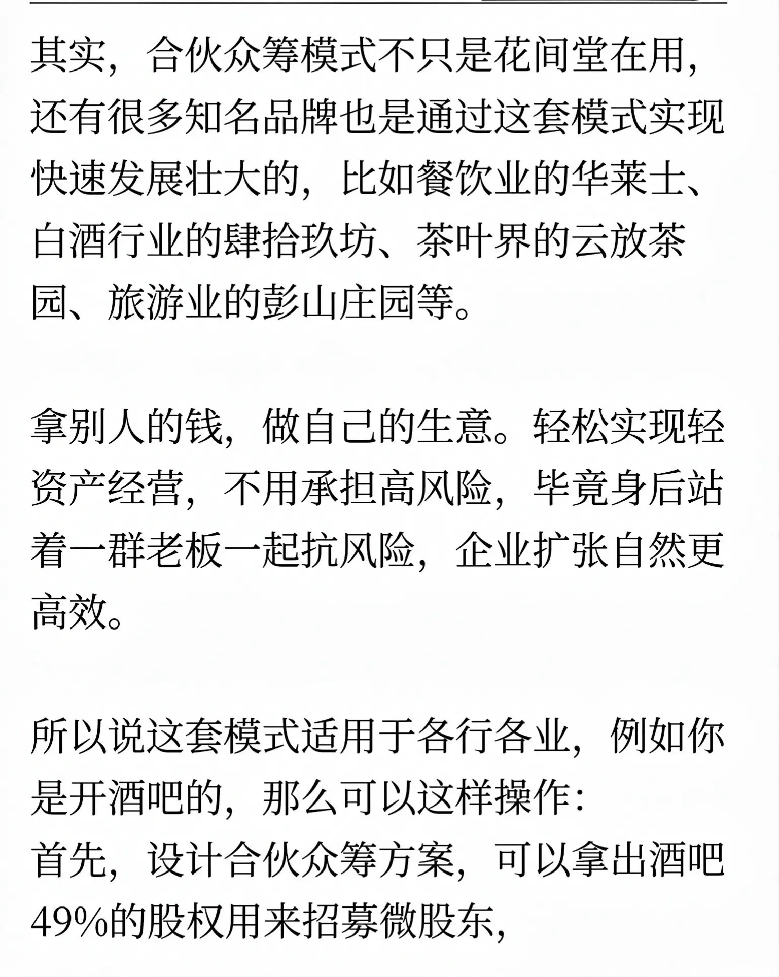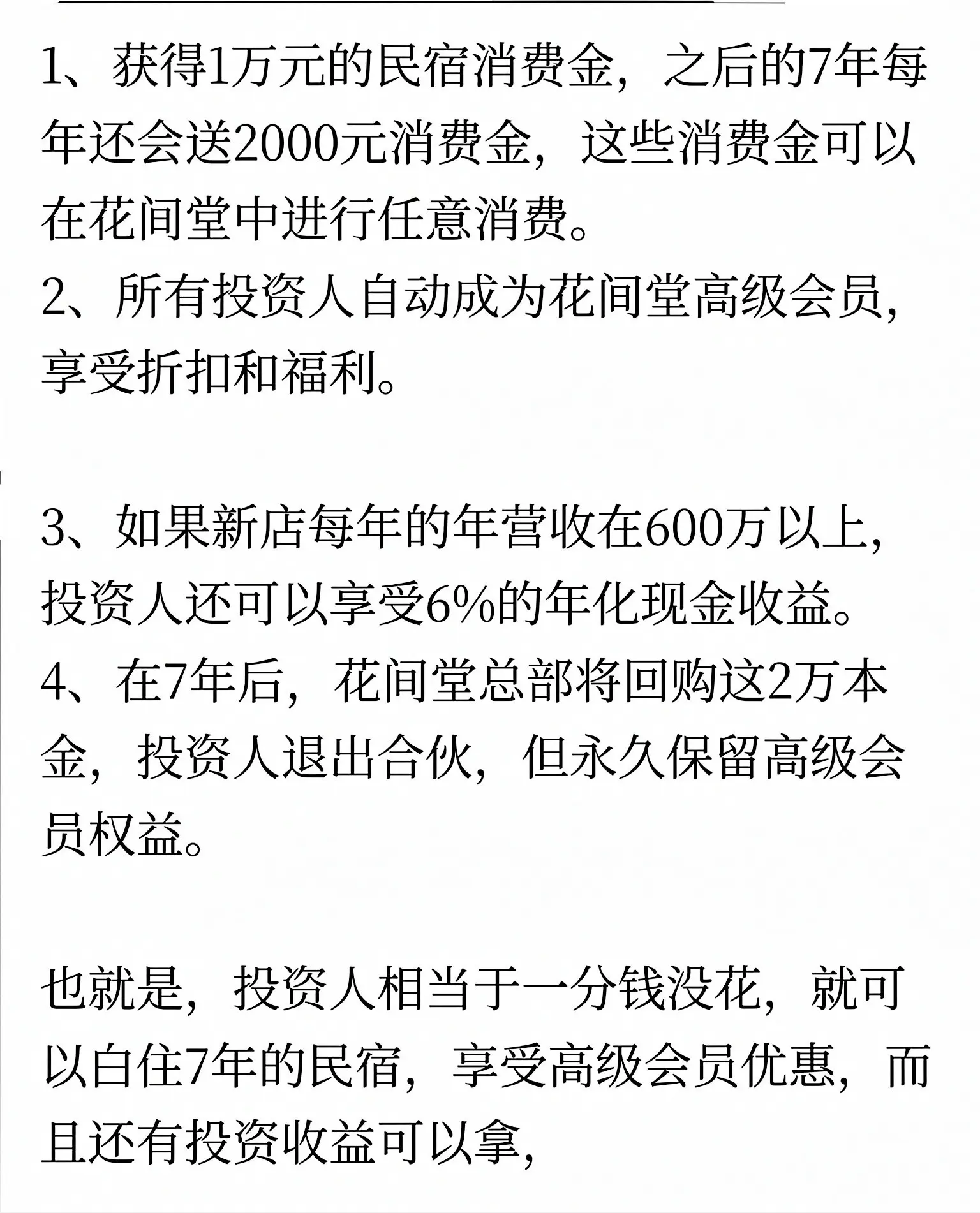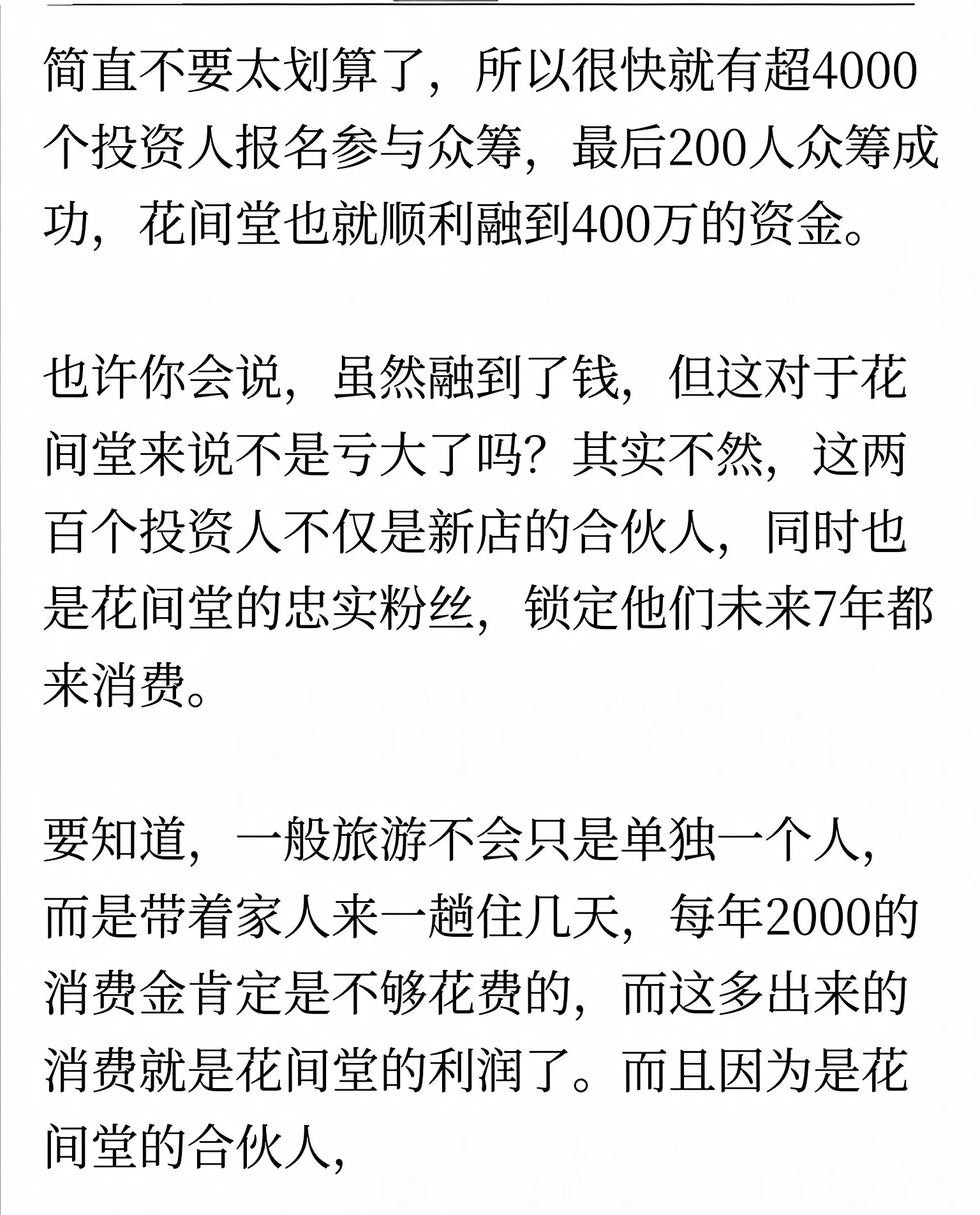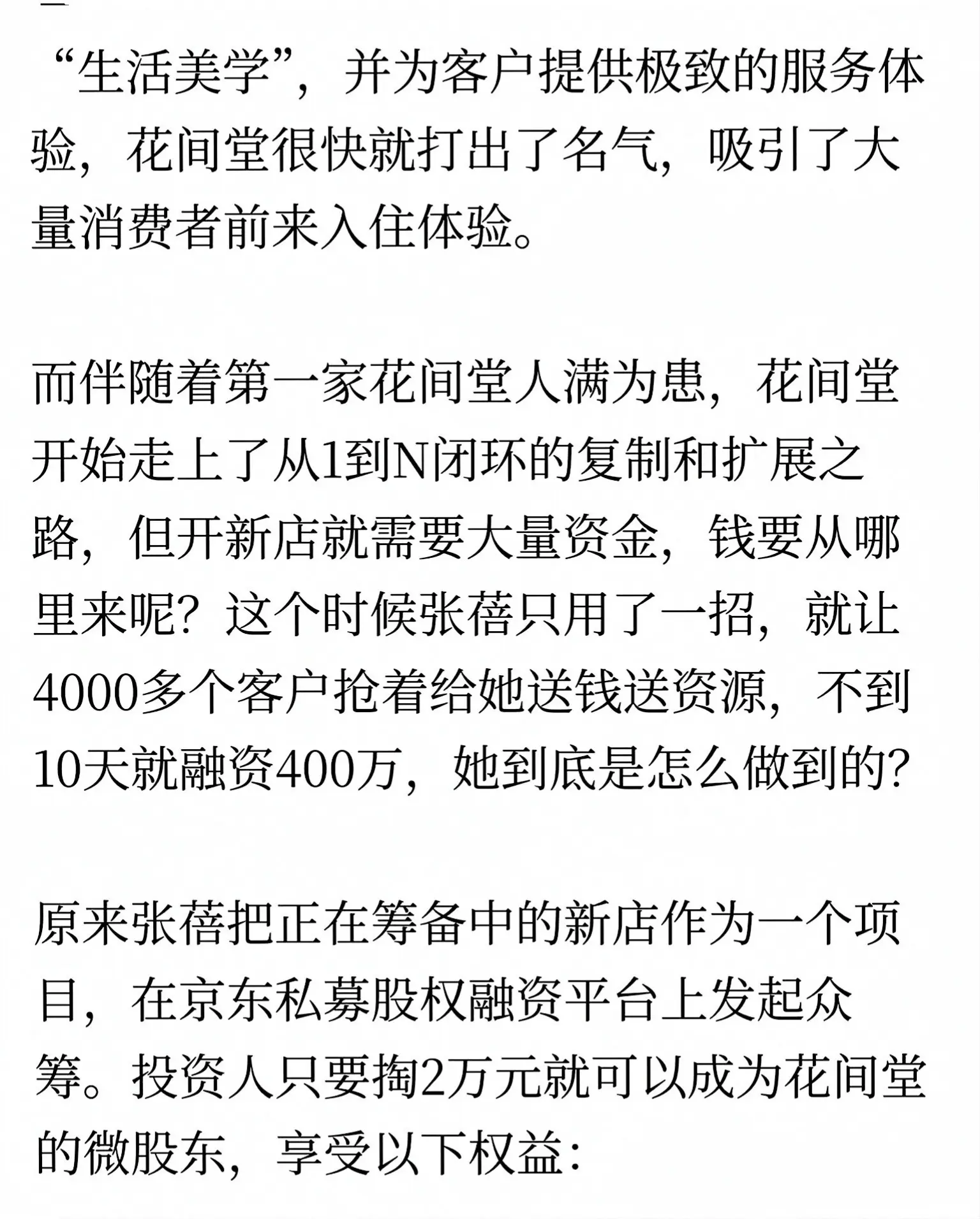 这绝对是教科书级的“空手套白狼”!浙江女老板张蓓,一分钱没掏,就把丽江小客栈打造成全国知名的花间堂民宿品牌。 她的核心玩法是众筹裂变:推出2万元“微股东”计划,投资人不仅能拿2.4万消费金,还享6%分红,7年后本金全退。这套模式让4000多位客户主动送钱,10分钟融资400万。 她把消费者变成合伙人与推销员,零成本快速扩张,完美诠释了轻资产、高裂变的顶级商业思维。