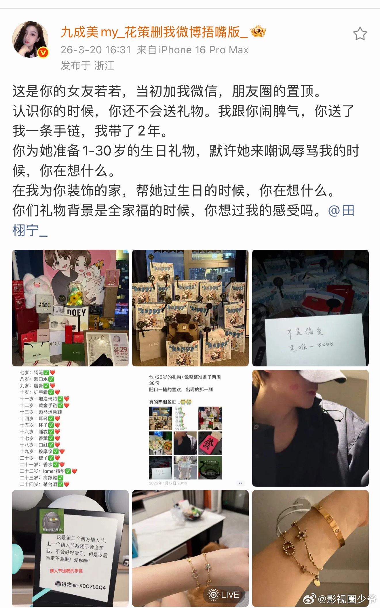 九成美 你想过我的感受吗九成美晒田栩宁送若若礼物,称:你为她送1-30岁生日礼物