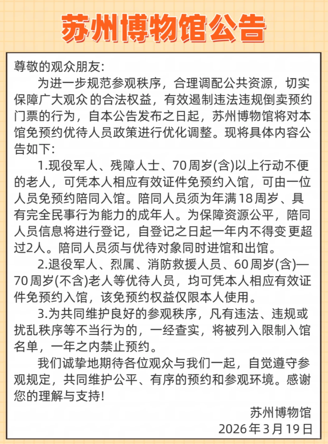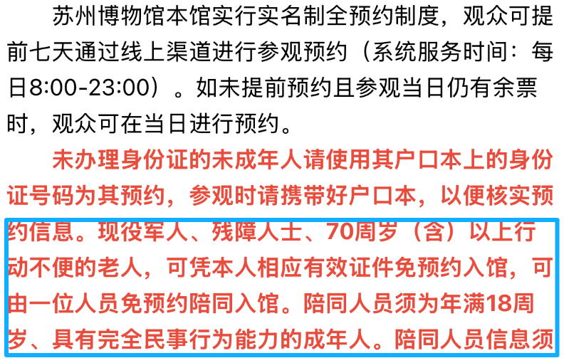 苏州博物馆预约须知注明,所有观众(优待人群除外)均需预约,包括儿童。参观指南中“优待人群”一栏写道:60周岁以上老人、残障人士、现役军人、退役军人、烈属、消防救援人员、荣誉献血个人、文博单位工作人员均可凭本人相应有效证件免预约入馆,并可由一位人员免预约陪同入馆,陪同人员与免预约人员须同时进馆。所有优待人员每三个月享受一次免预约入馆权益。
