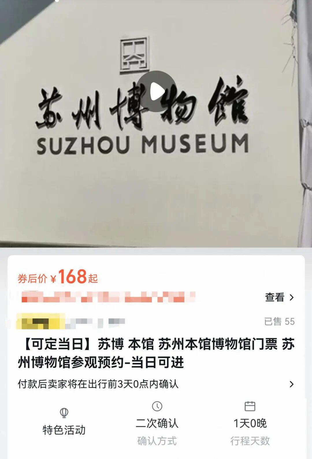 搜索发现,网络上有售卖苏州博物馆参观预约资格,商家宣称下单当日可进,售价168元。“黄牛”商家表示,游客需提前两小时下单,并预约时间,现场由老人带领进入苏州博物馆,走绿色通道免排队,当天“百分百”带入。