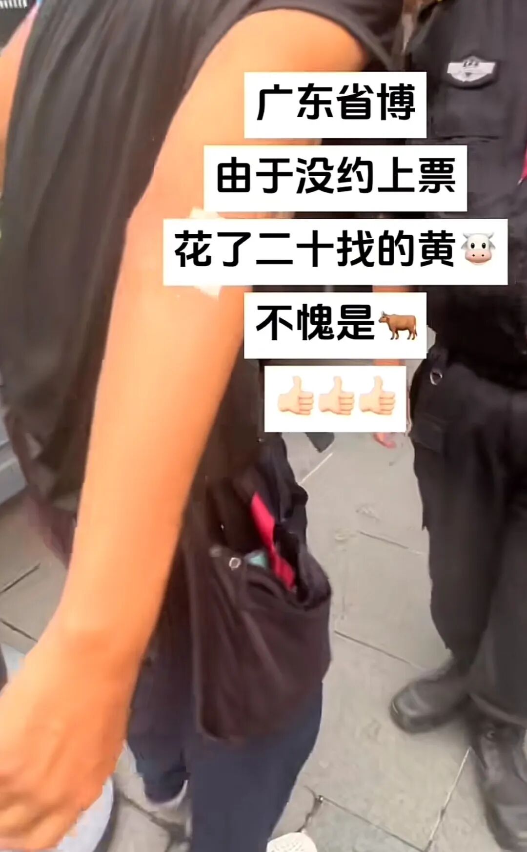 2025年8月,有一男子发视频称自己在广东省博物馆,“由于没约上票,花了20元找黄牛”。