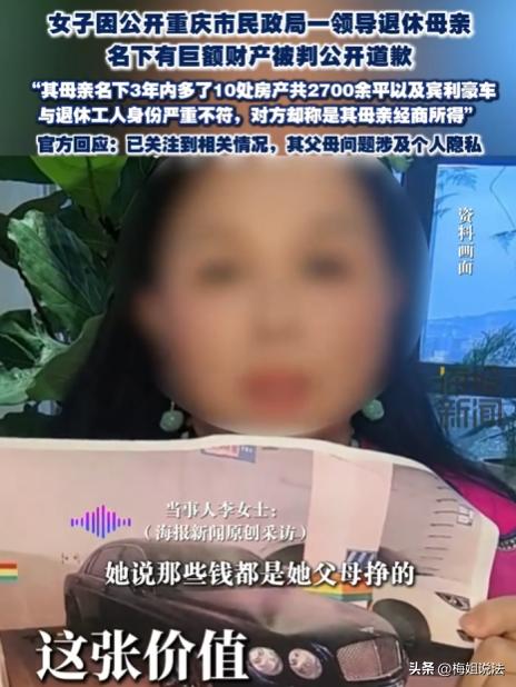 重庆,一女子发现某退休男子的母亲名下3年内突增10套共2700多平房产,价值几个亿,还有宾利豪车,觉得这事有些蹊跷,李女士觉得不对劲就举报了,没成想举报被下架,还被起诉要求公开道歉。官方回应说这是老人隐私,对方称财产是经商赚的,李女士拿不出证据,最后败诉了。 李女士,重庆人,是个爱较真的人。 那天,她看到一份资料,把她惊得下巴都快掉了,一退休男子的母亲,原本看着就是个普通老人,可在短短3年时间里,名下突然冒出来10套房产。 这10套房产,加起来足足有2700多平方米。按当时的市场价算,价值好几个亿呢! 更让李女士瞪大眼睛的是,老人居然还有一辆宾利豪车。 宾利,那可不是普通人家能有的车。 李女士心里犯起了嘀咕,这老人,不就是个普通退休工人吗?怎么会有这么多财产呢? 她越想越觉得不对劲,这背后肯定有猫腻。 不行,这事必须得查清楚。于是,李女士毫不犹豫地就去举报了。 可谁能想到,举报信息发出去没多久,就被下架了。 李女士还没反应过来,紧接着又收到通知,要求她公开赔礼道歉。 这一下,李女士彻底傻眼了,她怎么也想不明白,自己明明是做好事,怎么就变成这样了呢? 官方给出的说法是,李女士反映的不是工作问题,而是老人父母的隐私。 李女士一听,这算怎么回事?自己举报的是财产来源不明,怎么就成侵犯隐私了? 对方则说,这些财产都是老人经商赚来的。 李女士大声质问:经商赚来的?拿出证据来!可对方就是拿不出确凿的证据。 李女士也确实拿不出能证明对方财产来源不明的证据,毕竟她只是偶然发现,没有深入调查过。 就这样,在一番争执之后,李女士败诉了。 这事一传开,网友们纷纷发表自己的看法,大多数人都觉得这事疑点重重。 有人说,这老人要真是经商赚了这么多钱,那肯定得有相关的经营记录、纳税证明什么的,怎么就拿不出来呢? 也有人说,就算真的是经商所得,那这赚钱的速度也太快了吧,3年就赚好几个亿,还买了10套房产和一辆宾利,这得是什么样的生意? 还有人质疑,隐私不该成为不查清事实的理由,如果因为涉及隐私就不去调查,那以后是不是所有类似的事情都可以用隐私来搪塞呢? 李女士觉得自己没错,自己只是想让真相大白而已。 可现在,她却成了败诉的一方,还得公开道歉,这让她怎么也想不通。 李女士的举报行为,为何会被判侵权? 举报没错,但根据《民法典》第1032条,自然人享有隐私权,任何组织或个人不得非法公开他人隐私。 李女士将老人的房产、车辆等未被证实违法的财产信息公开举报,未经老人同意,属于非法披露他人隐私,这是法院判其侵权的核心依据。 质疑违法,不代表就可以随意公开他人的信息,即使质疑合理,公开他人未被证实违法的隐私,依然可能构成侵权。 被举报方称财产为经商所得,为何无需举证呢? 难道只要说经商所得,就可以吗? 这里需要明确,民事诉讼中,谁主张谁举证,李女士主张财产来源非法,就需承担举证责任。 而被举报方无需举证自己没违法,只需反驳李女士的证据不足即可,这也是李女士败诉的关键,并非偏袒被举报方。 公职人员亲属的财产,能以隐私为由拒绝核查吗? 老人并非公职人员,其财产原则上属于隐私,但如果其财产与公职人员亲属身份高度不符,相关部门仍可依法核查。 只是李女士的公开举报方式,不符合合法监督的要求,这也是公众最容易混淆的监督权与隐私权的边界。 隐私。不该成为财产来源不明的保护伞,监督也不该成为侵犯他人权益的借口,可未查清的财产来源,真的能就此搁置吗? 在这个信息时代,如何平衡隐私和真相的关系。当遇到类似的事情时,该如何去处理,是选择相信官方的说法,还是坚持自己的怀疑,继续追查下去呢? 您觉得在这件事里,隐私和真相到底该如何平衡呢? 信息来源于:海报新闻、