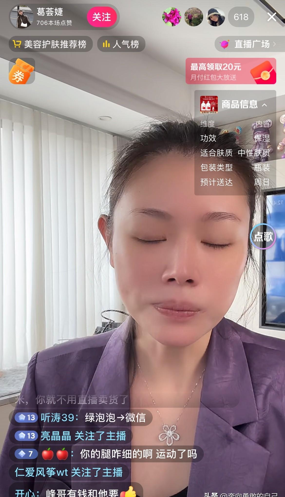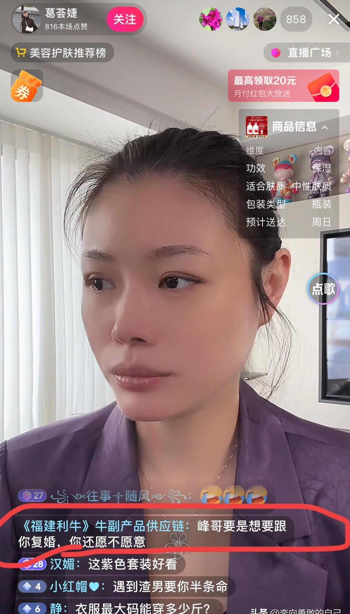 嗓子哑了还坚持直播。 前夫的名字一出现,她反应快得像触电。 “不复,不愿意。 ” 这三个字,她咬得特别清楚。 葛荟婕直播时被问会不会和汪峰复婚。 她当场拒绝,连“峰嫂”这个称呼也一并推开。 感冒没好全,但态度一点不含糊。 很多人等着看她的狼狈。 流量低的时候,有人说她过气了。 她却看得透亮。 “高峰流量都是来看八卦的,那不是我的消费群体。 ” 这话里有种难得的清醒。 不靠前任的热度博眼球,也不为人数焦虑。 她在经营一份真正属于自己的事业。 更难得的是那份体面。 网友调侃“汪峰一场演唱会,够你播一年”。 她大方承认:“他确实有才华。 ” 不贬低,不纠缠。 把私人恩怨和职业成就分得清清楚楚。 这种分手后的风度,比撕扯好看太多。 她聊起学生时代是短跑队员。 原来那份坚持和耐力,早就刻在骨子里。 晚上还要赶下一场直播。 你看,跑道上练出的劲头,现在全用在生活里了。 成年人的体面,不是假装什么都没发生。 而是把过去轻轻放下,然后认真跑好自己的赛道。 她跑得或许不快,但每一步都踩得实在。 这比什么都强。