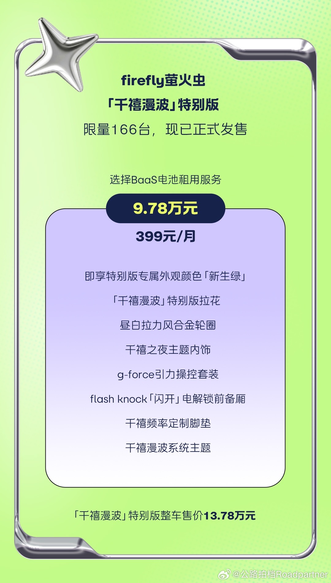 萤火虫今日发布了全新千禧漫波限量版!限定166台,新生绿作为限定色限时返场,G-force悬架套件标配,更有大家所期待的点解锁前备箱当然老用户对于这个功能感兴趣的话也仅需1280元升级即可firefly萤火虫