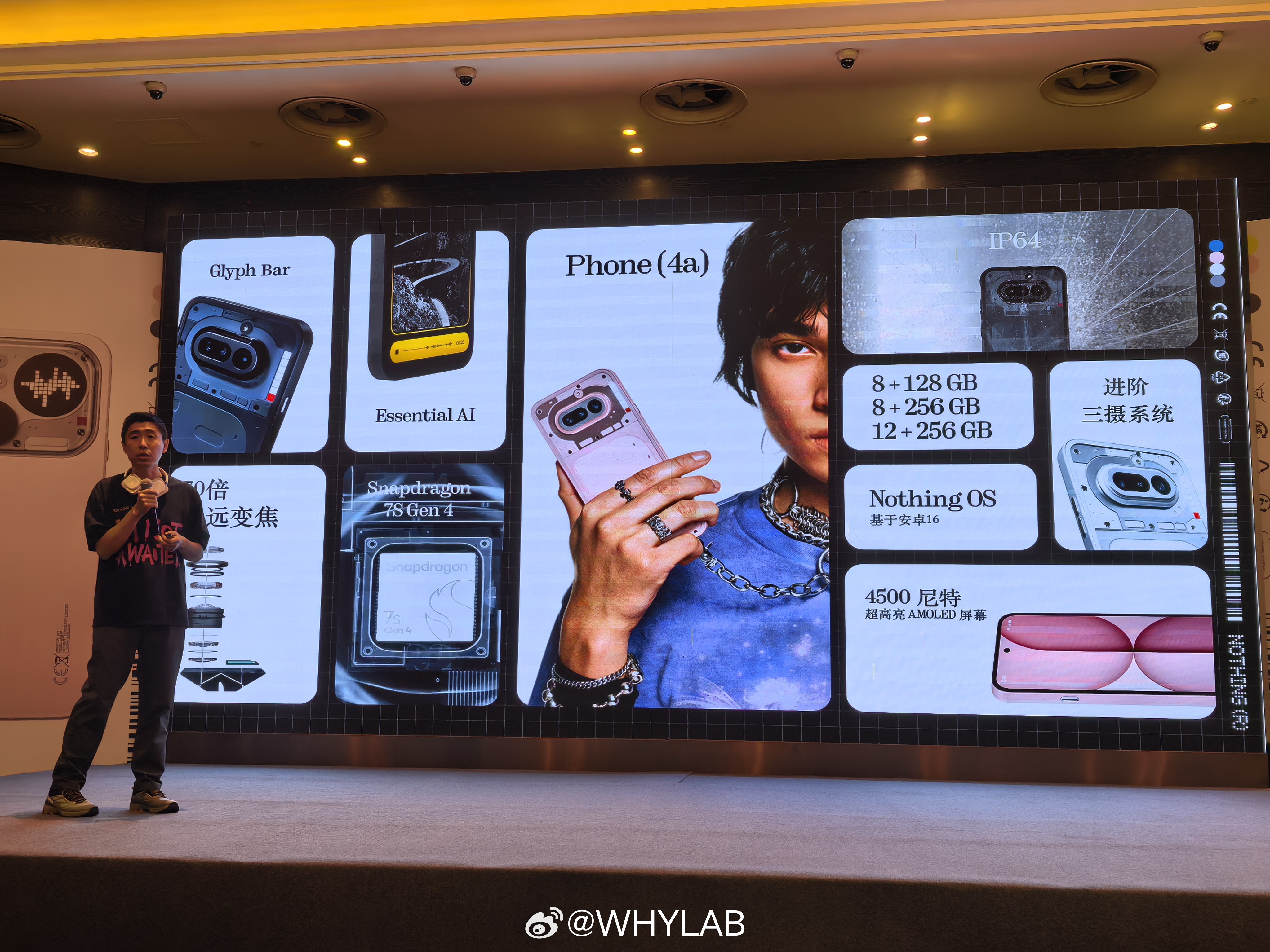 - 其他:厚 8.55mm,重 204.5g,白色、黑色、蓝色、粉红色 4 款配色,塑料中框,双麦克风双扬声器,支持 Wi-Fi 6、蓝牙 5.4,屏下光学指纹,单频 GPS 单频北斗,IP64 防尘防水,支持 eSIM、NFC,配备全新 Glyph Bar 灯光(63 颗 mini LED),搭载 Nothing OS 4.1 系统。nothingphone4a打破规则的创造力