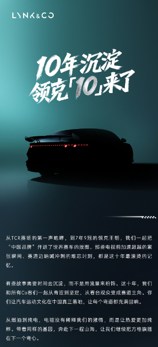 车若初见 领克中大型纯电轿车,正式命名领克10,第二季度上市,海报上亮出了设计手稿,运动感很强,还放出了一段小故事,今年是领克的第10年,用10作为产品命名,很大胆也很自信,中大型纯电主打“真运动”,这个搭配挺有意思,领克坚持操控和驾驶质感的那股劲儿,放在纯电上也是相当够使的。