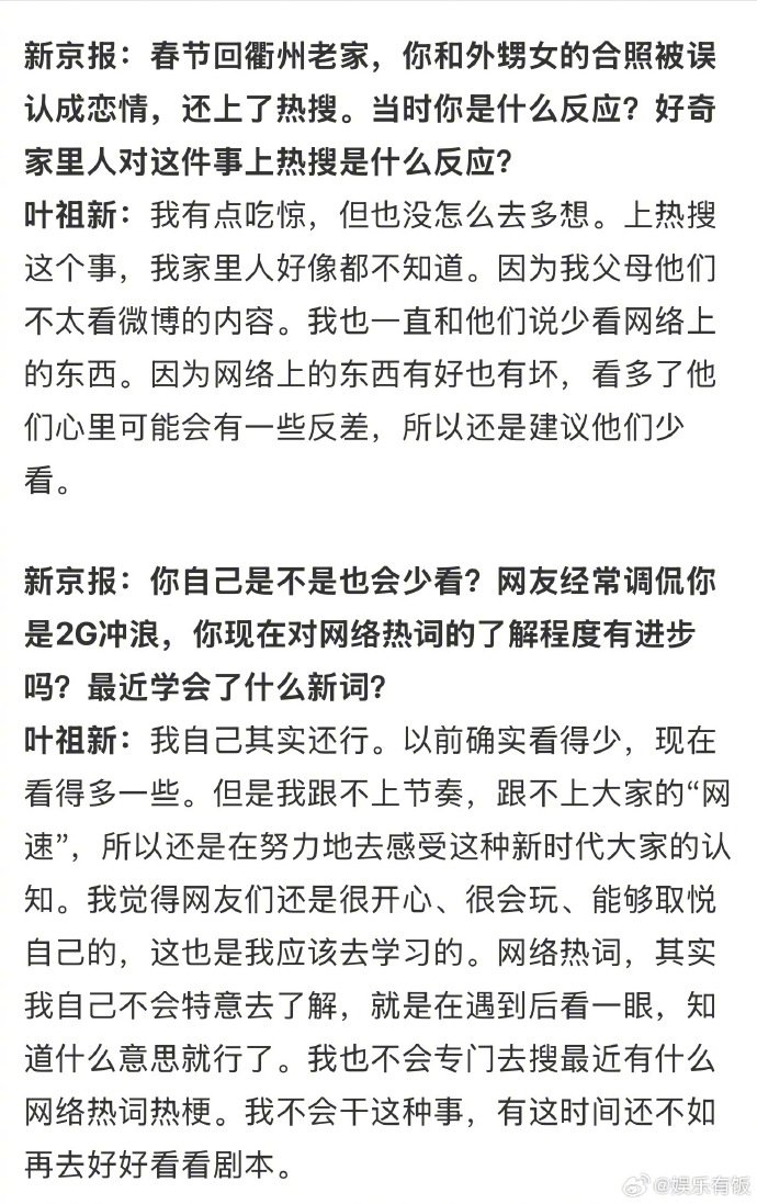叶祖新回应被网友误会官宣恋情 叶祖新聊起“被官宣”乌龙事件,直言自己没太放心上,特意叮嘱家人别受影响。